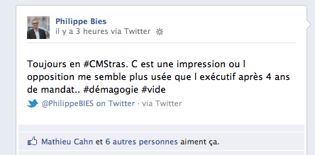 Et pour cause, à deux reprises, une première fois il y a quelques mois, une seconde ce mardi même, Robert Grossmann a cité en plein conseil un statut sur Twitter et Facebook tout juste posté par Philippe Bies, adjoint au maire, qui écrivait :