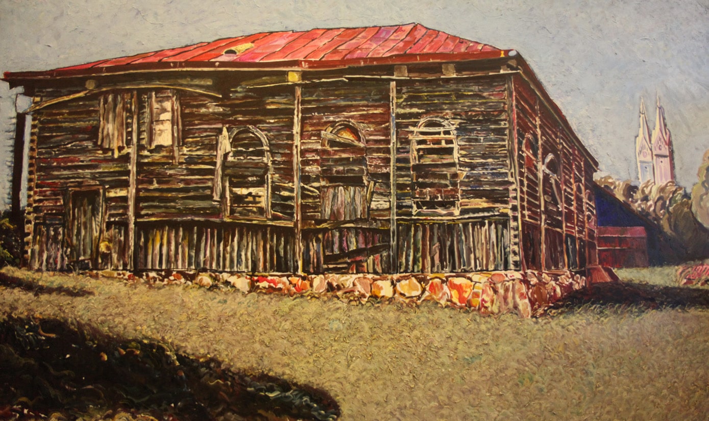 « J’en ai compté quinze, mais depuis mon passage il y a quelques années, certaines ont disparu. Elles servent de dépotoir, de hangar, ne sont pas entretenues et sont bien souvent ouvertes aux vents et aux pluies. Je ne comprends pas pourquoi on dépense des millions d’euros à préserver Auschwitz quand de vieilles synagogues en bois (uniques au monde) s’abîment et que les dernières traces d’une vie juive avant le génocide disparaissent. J’ai voulu peindre les bâtiments de manière réaliste, pour les garder en mémoire. Malheureusement, ça n’accroche pas ici ; personne n’a d’intérêt pour cette histoire. »
