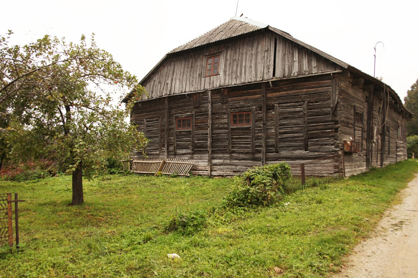 Dans les campagnes, les synagogues en bois sont méconnaissables. Elles se mêlent aux vieilles fermes et aux granges. À Rozalimas, par exemple, aucune plaque n’a été posée sur les planches abîmées du vieux bâtiment en bois. Nous peinons à comprendre qu’il s’agit de la vieille synagogue du village.