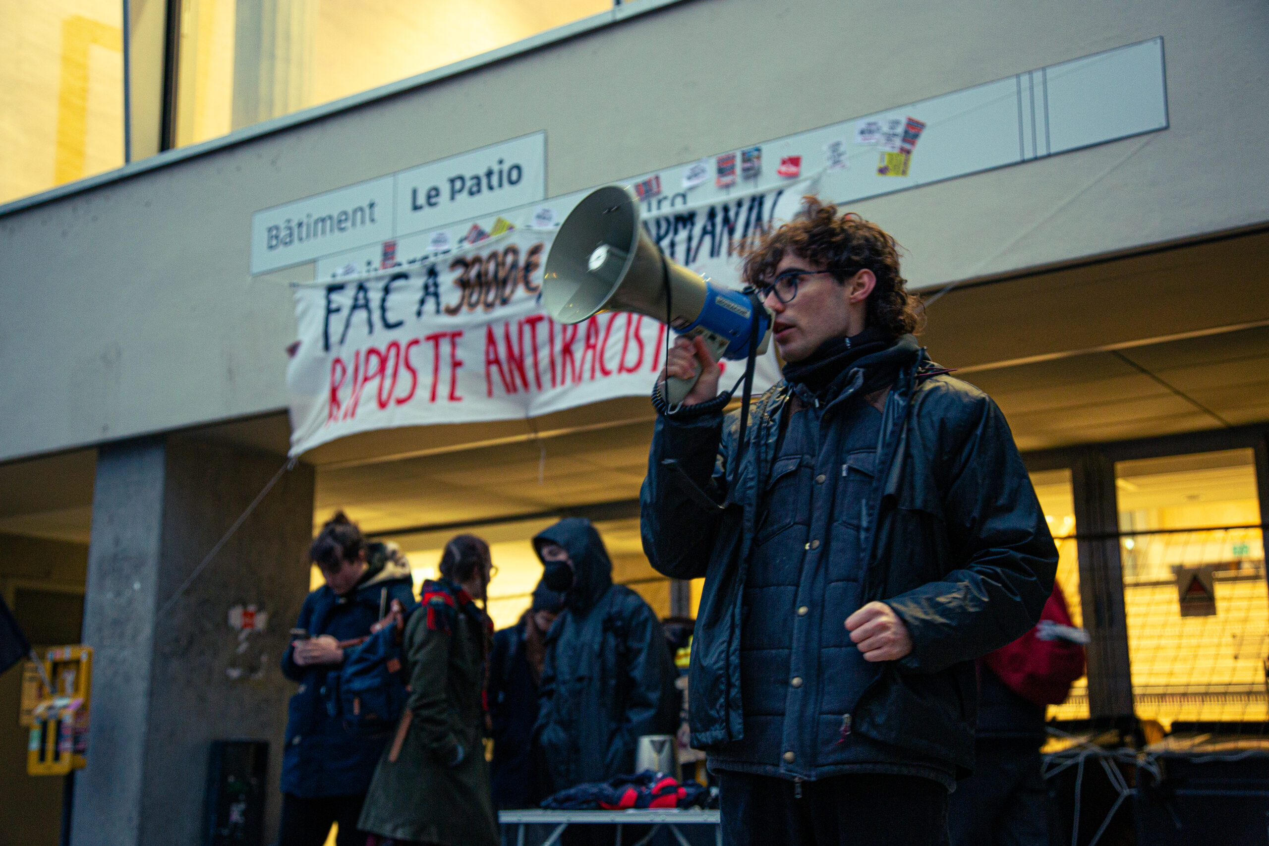 L’action de blocage concerne un bâtiment dans lequel des cours et des examens sont prévus ce jeudi matin. Elle est organisée par deux syndicats étudiants et soutenue par plusieurs collectifs, tels que D’ailleurs nous sommes d’ici, l’Action antifasciste Strasbourg et Extinction Rebellion. Dès 7h30, un agent de l’Université vient à la rencontre des étudiants pour tenter de faire cesser le blocage :