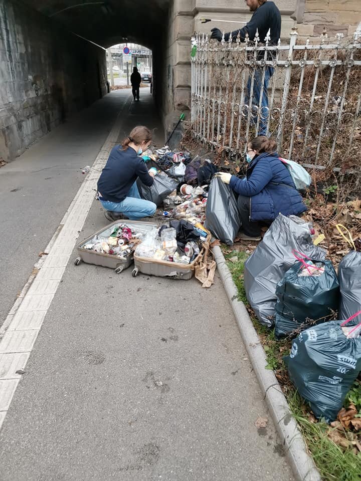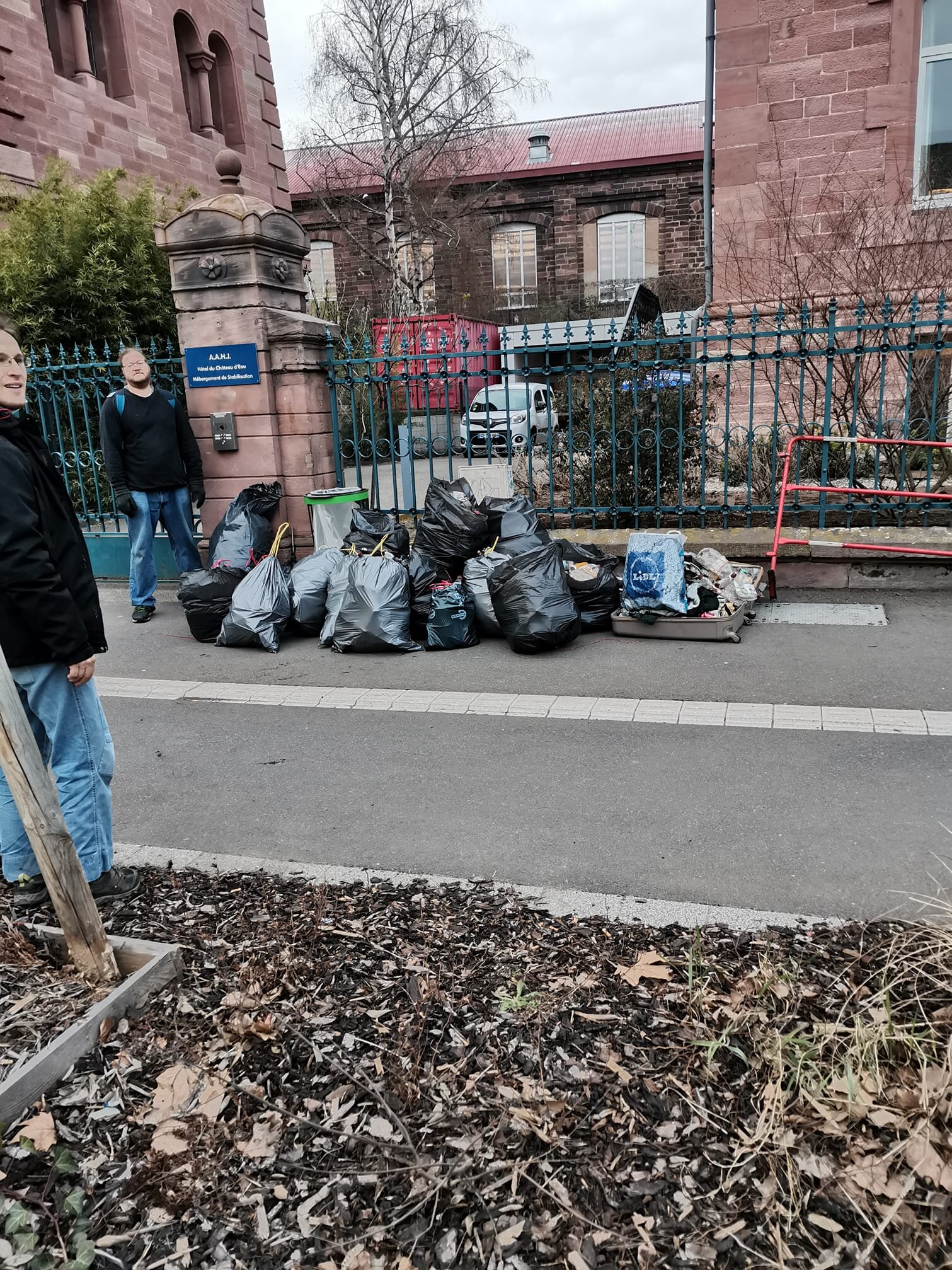 « On n’a même pas fait 100 mètres pour trouver toutes ces ordures. C’était juste dans l’herbe, derrière une grille, » raconte Loïc Krun. À la fin de la journée, les quatre camarades décident de déposer les 30 sacs poubelles résultant de leur opération, sur un trottoir de la rue de Koenigshoffen, à côté d’une poubelle publique, devant le bâtiment de l’Association d’accueil et d’hébergement pour les Jeunes.