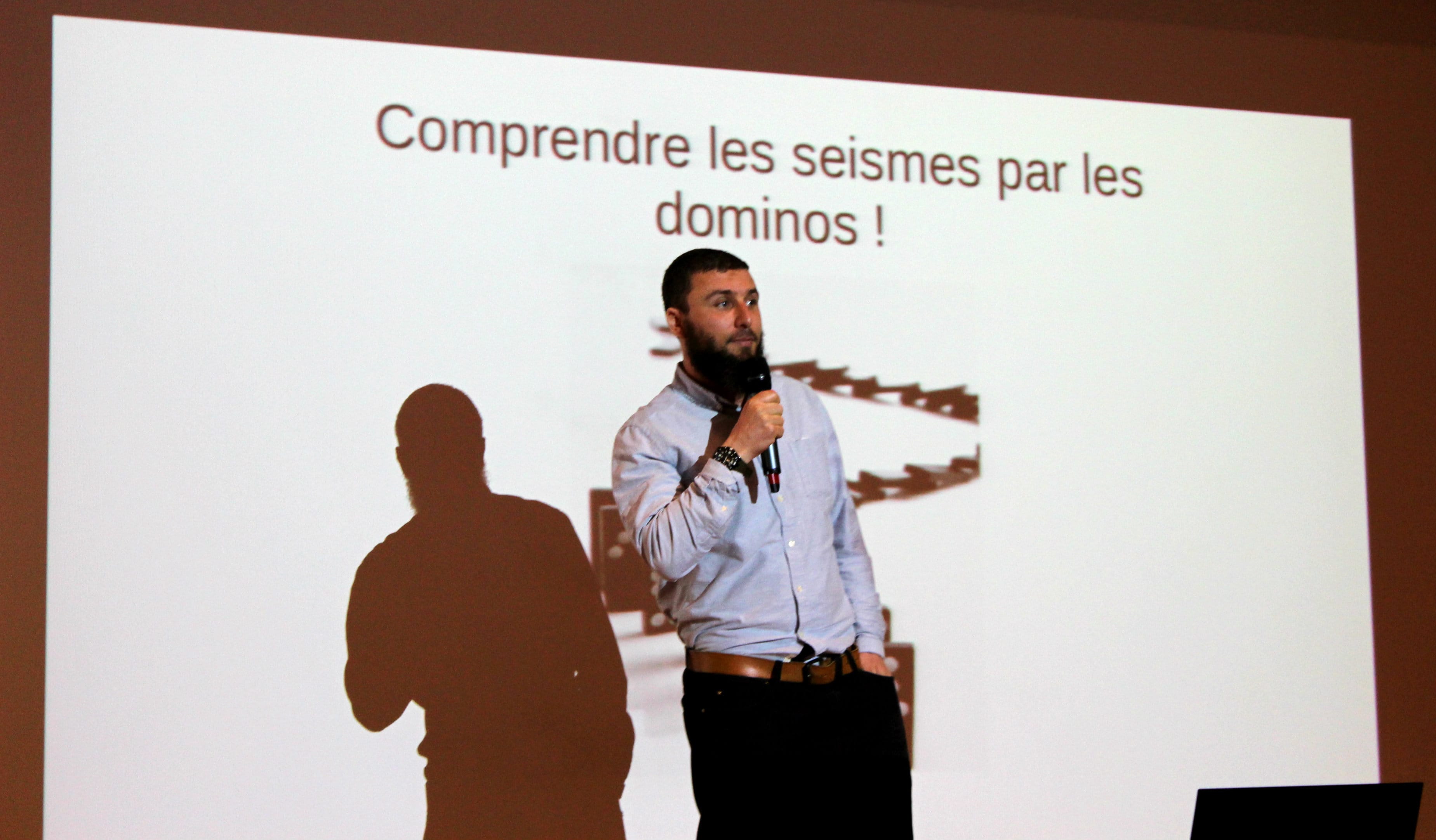 « Aujourd’hui, on ne va parler ni d’extrémisme, ni de terrorisme ou d’hipsterisme, mais de séisme ! » La formule de Jugurtha Kariche, algérien et barbu, fait mouche. La salle rit et écoute. En 180 secondes, pas une de plus, il doit expliquer son sujet de thèse : comment les séismes se répondent et s’articulent avec les failles. Il prend l’exemple des dominos. Malheureusement, un trou de mémoire coupe ce bel élan deux minutes plus tard.
