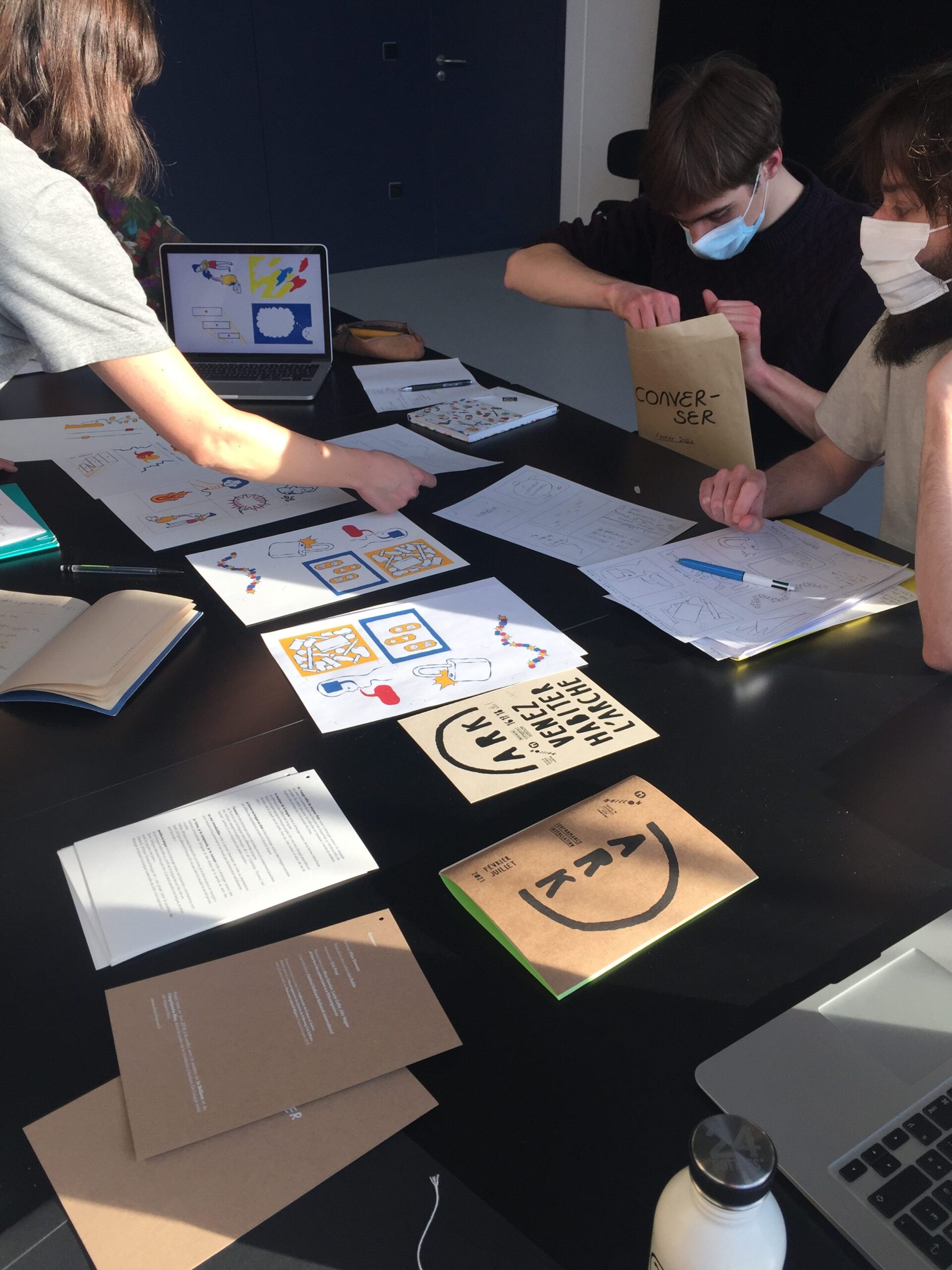 Extrait du jeu Converser imaginé par Élise Simonet et transcrit par les étudiants en illustration de la HEAR (document remis).