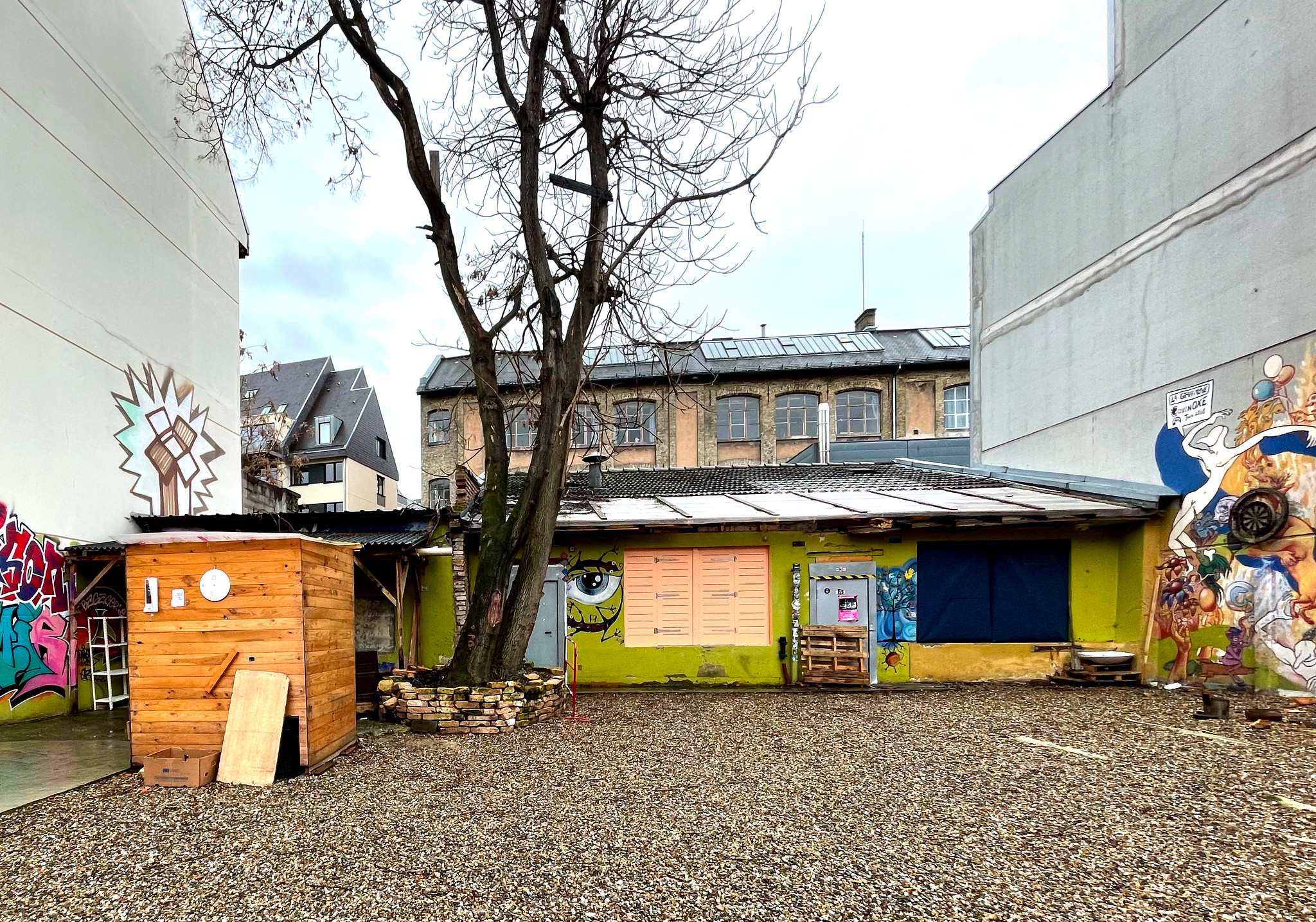 Depuis douze mois, les bénévoles ont continué de faire vivre l’association où ne survivent que la bagagerie et une salle appelée « la putsch ». La maison historique à colombages de deux étages a été complètement rasée, la cave comblée et le sol, recouvert de gravier et surnommé par certains « Mimir Plage ». Fermé par de simples barrières de métal, l’espace dispose encore d’une petite boîte aux lettres vertes sur laquelle sont inscrites les horaires de la bagagerie – trois demi-journées par semaine.