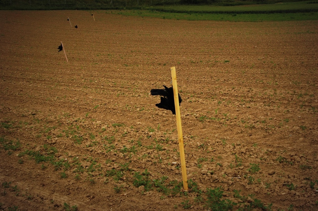 Ils sont là, par dizaines à pendouiller ainsi au milieu des champs. Les plastiques noirs ne sont qu’en première ligne, pour tromper les curieux. Pour le reste, des corbeaux mis hors d’état servent d’exemples à ceux – encore vivants – qui chercheraient à se nourrir des semis dispersés dans les champs.
