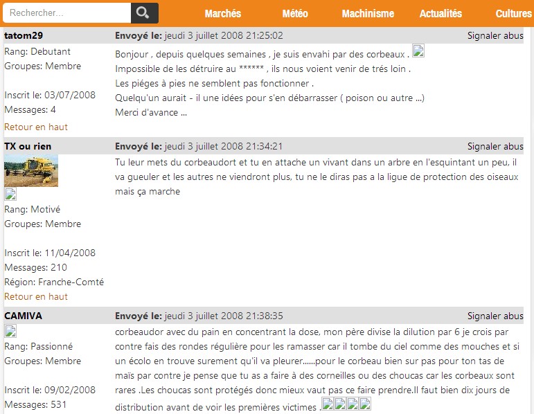 « Faut savoir qu’un corbeau fait autant de dégâts qu’un sanglier. On est arrivé à un stade où il n’y a plus d’autres solutions que les potences. Tirez et le corbeau ira sur une autre parcelle. C’est une espèce intelligente : une fois qu’elle a repéré le chasseur, elle ne revient pas au même endroit, mais elle va faire des dégâts ailleurs. On peut utiliser des cages à corbeaux, avec des oiseaux vivants à l’intérieur pour les attirer et les attraper. Mais ces cages sont systématiquement détruites par les intégristes écolos… »