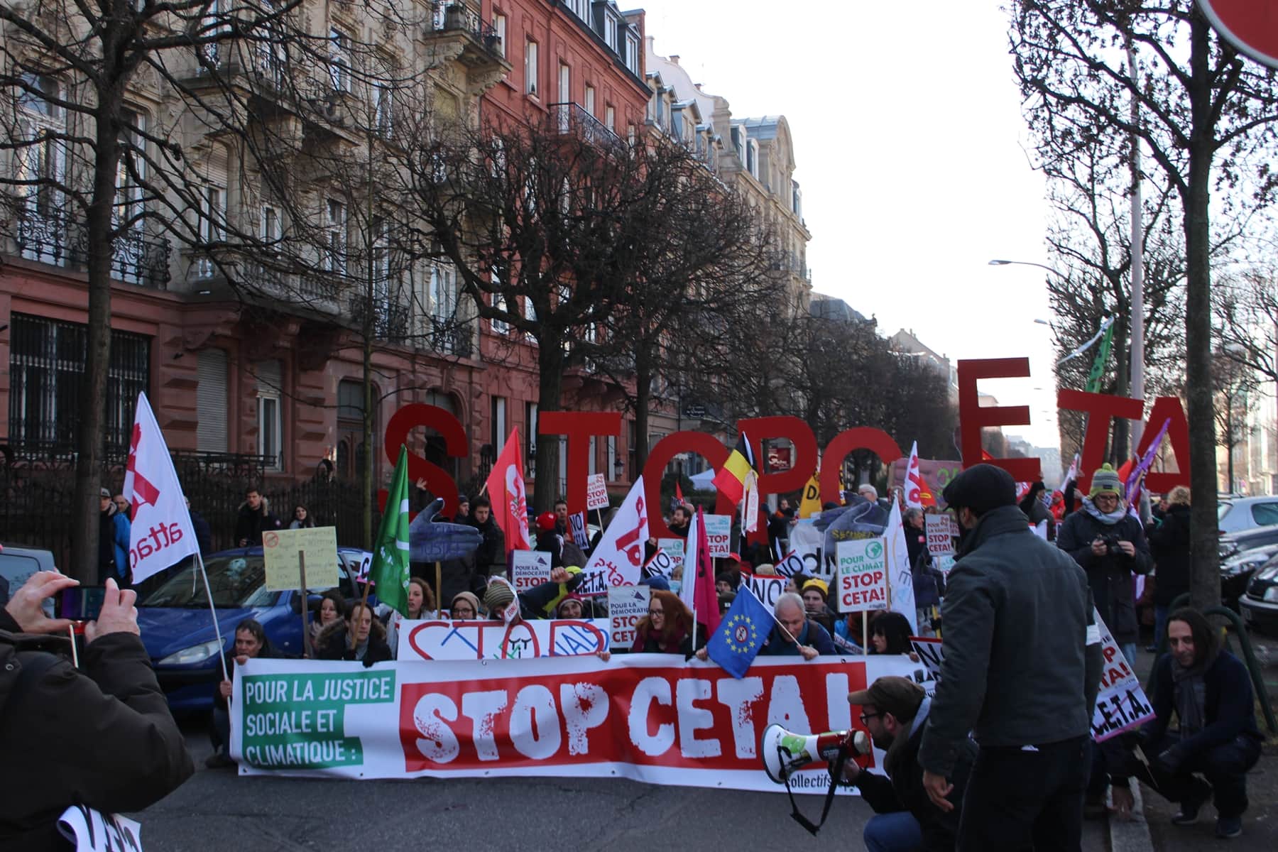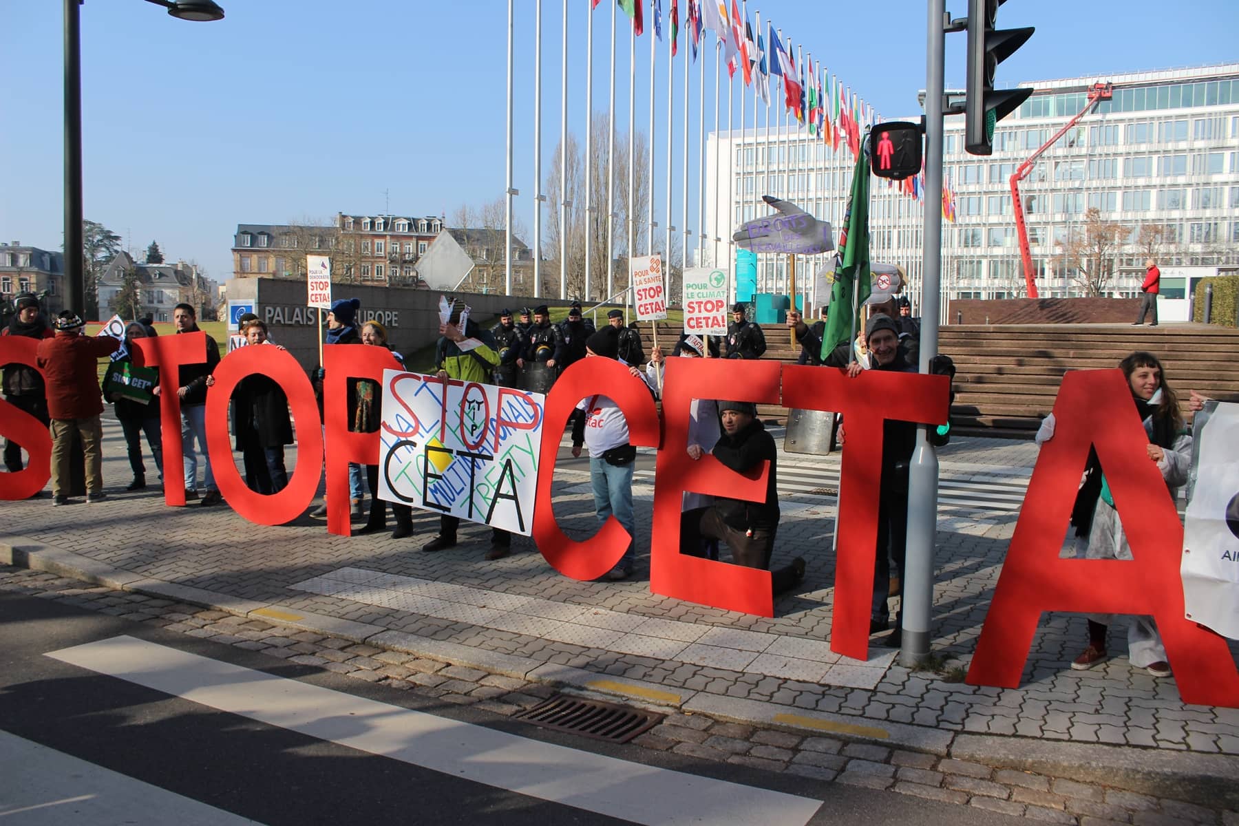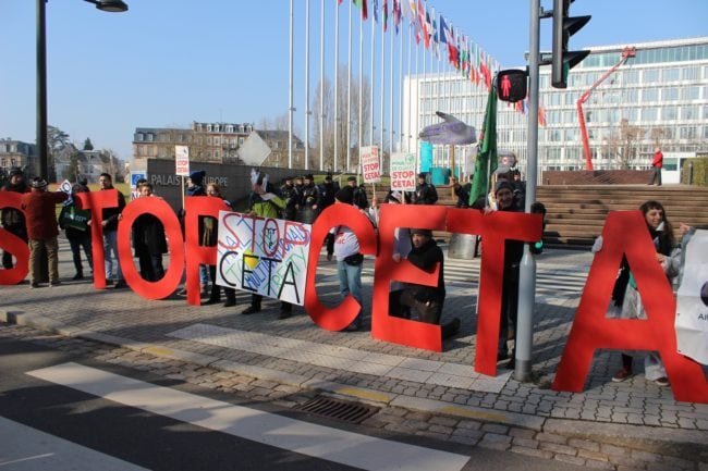Entre 700 et 1 000 personnes se sont retrouvées mercredi à Strasbourg pour protester contre l’approbation, par le Parlement européen, du traité de libre-échange entre l’Union européenne et le Canada, le CETA. Cet accord prévoit un abaissement des barrières douanières et une harmonisation des législations entre l’Europe et le Canada. Il sera effectif dès le mois avril, avant même d’être ratifié par les parlements nationaux et régionaux de l’Union européenne.
