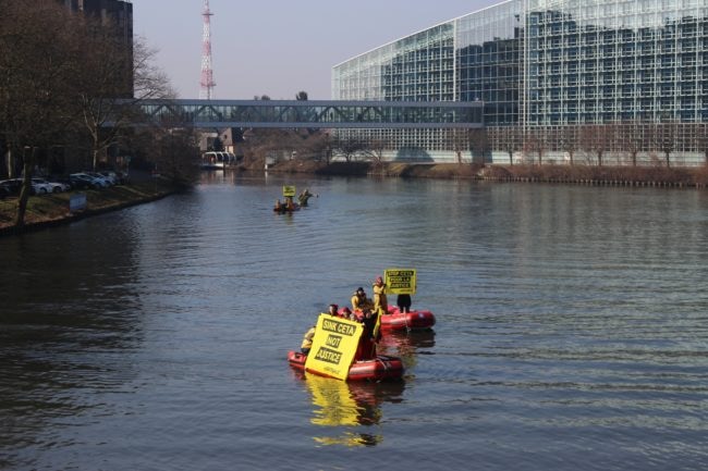 Un millier de personnes, 700 seulement selon la police, ont protesté contre la signature, mercredi par le Parlement européen, du traité de libre-échange entre la France et le Canada (CETA). Certains se sont rassemblés place Kléber, d’autres ont réalisé des happenings devant l’hémicycle européen.