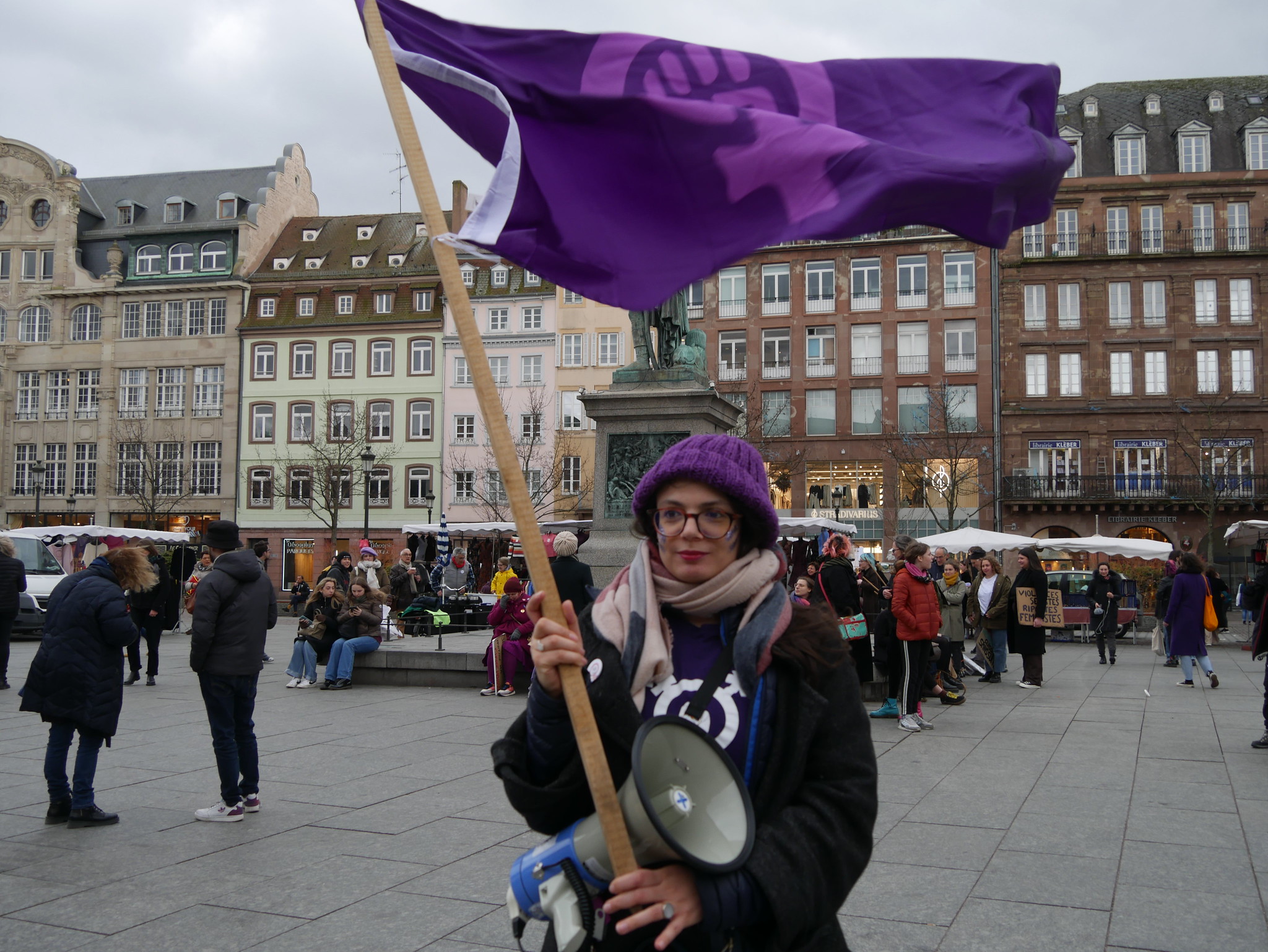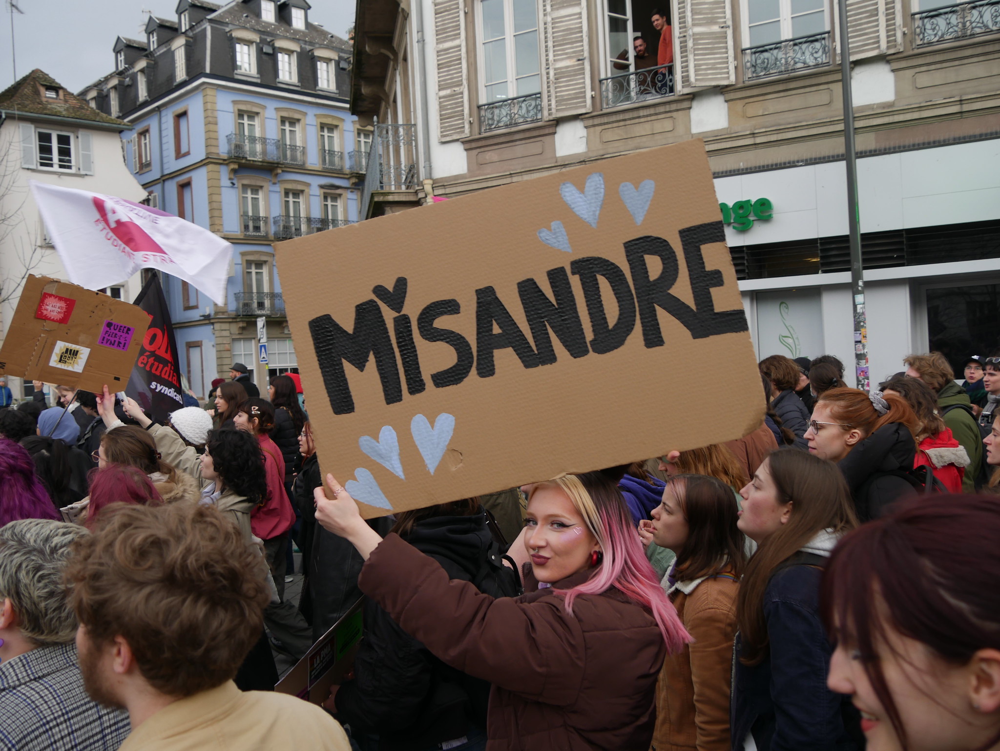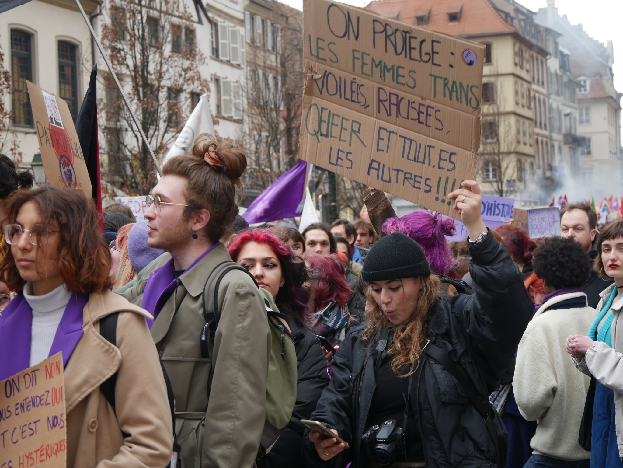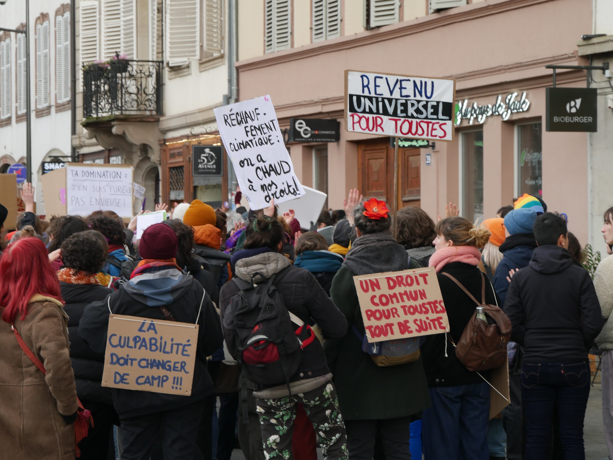 « Mon corps, mon choix, et ferme ta gueule ! » « On rasera ni les murs ni nos poils ! » « Nos droits ne devraient pas faire débat ! » Dans la foule qui se massifie place Kléber, en ce début d’après-midi du mercredi 8 mars, nombreuses sont les pancartes à insister sur le droit des femmes à disposer de leurs corps. Pour la Journée internationale de lutte pour les droits des femmes, plus de 2 000 personnes ont répondu à l’appel à manifester de l’Assemblée féministe de Strasbourg.