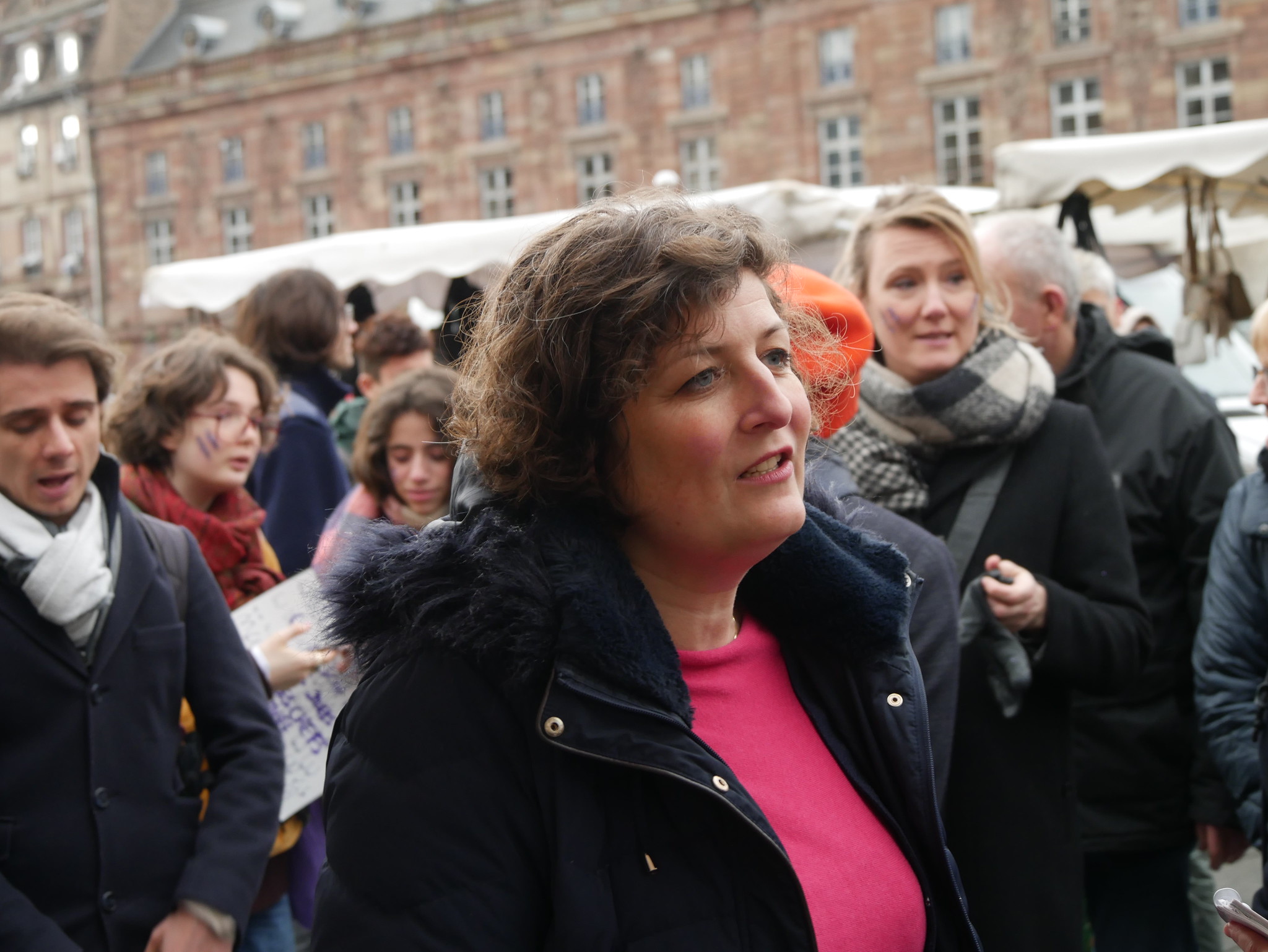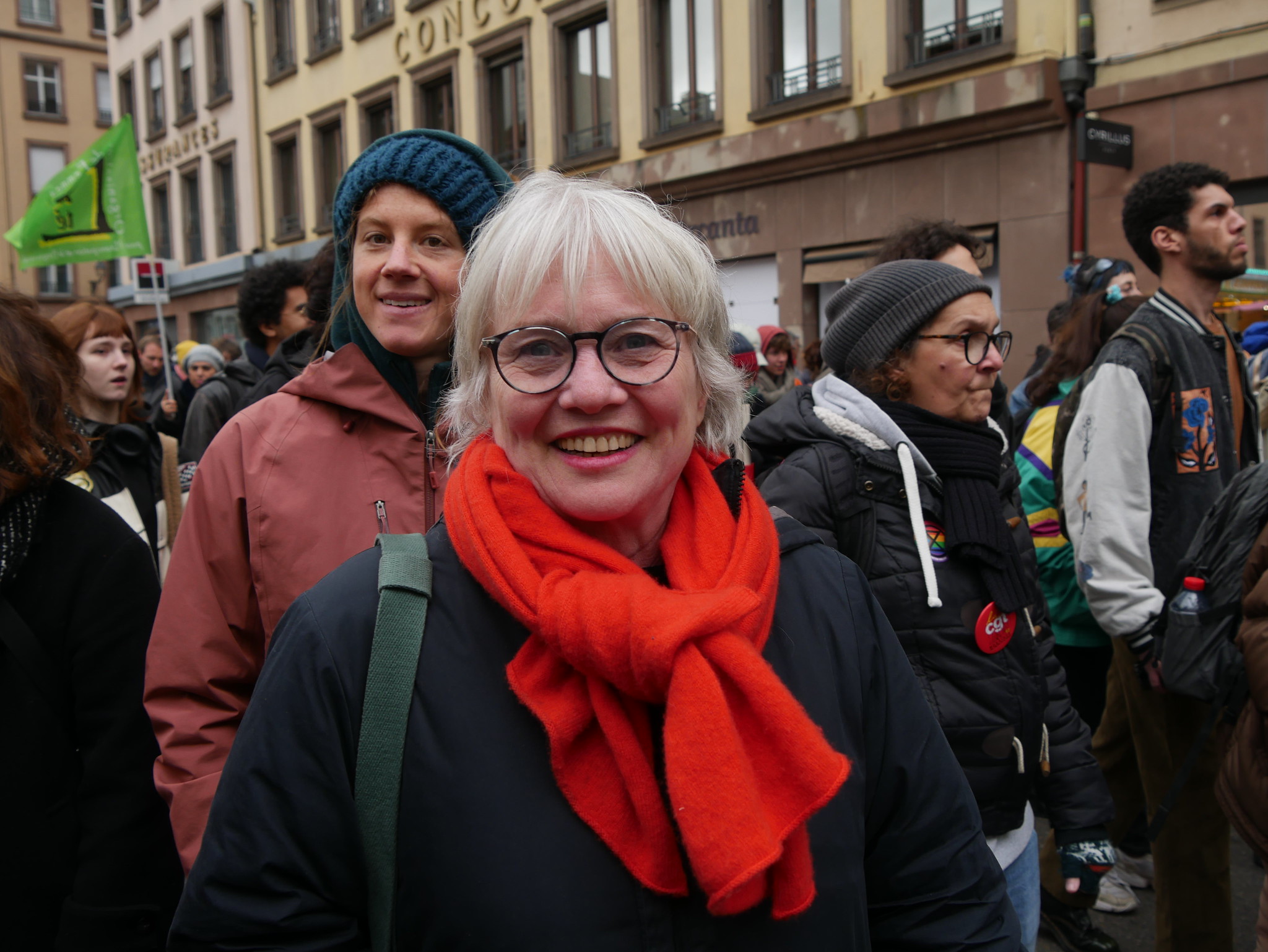 14h. La foule est redirigée vers la rue des Grandes-Arcades en prévision du départ. Anonyme parmi les manifestantes, au fond de la place, Jeanne Barseghian a fait le déplacement. Réagissant à l’actualité, la maire (EE-LV) de Strasbourg avoue être « très choquée par cette inscription qui assimile l’IVG à une violence » le jour où la Ville a prévu de rendre honneur à Gisèle Halimi, rebaptisant la place du Tribunal :