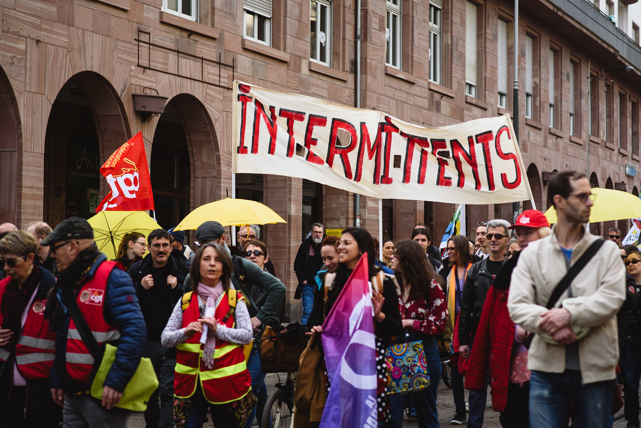 La manifestation parcourt une distance assez restreinte, bifurquant rapidement vers les rues du Vieux-Marché-aux-poissons et des Grandes Arcades pour rejoindre la place Kléber, dans une ambiance très calme. Le soleil rend la marche agréable, mais l’affluence est bien au-dessous de celle, historique, du mouvement social contre la réforme des retraites début 2023.