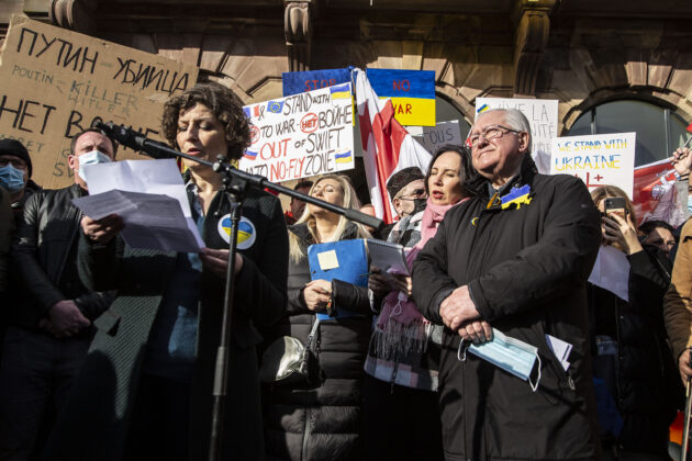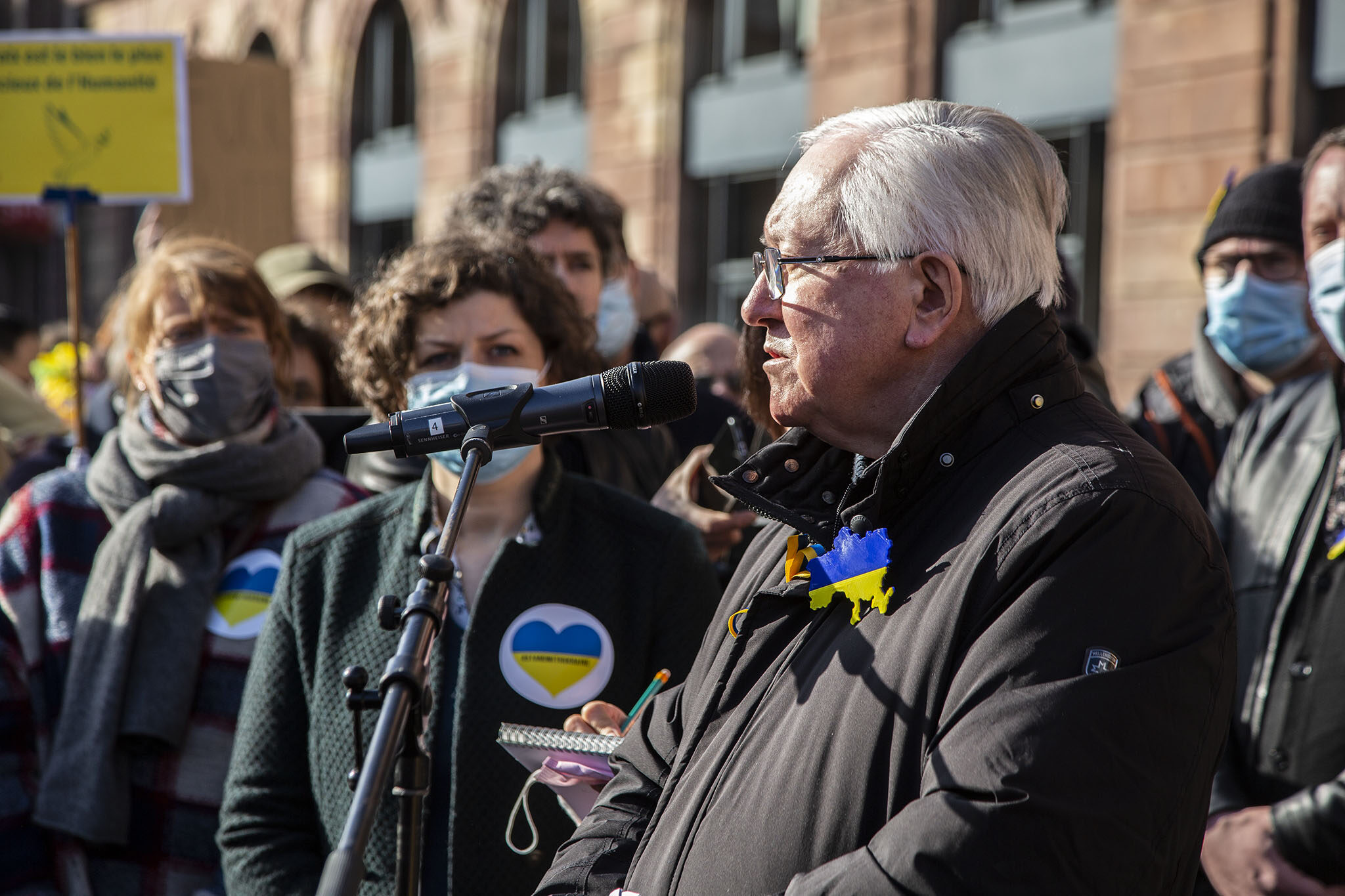 Borys Tarasyuk, ambassadeur et représentant permanent de l’Ukraine au Conseil de l’Europe, a pris la parole, en s’appuyant sur les haut-parleurs installés sur le balcon de l’Aubette. Il a remercié la Ville de Strasbourg pour avoir éclairé le centre administratif aux couleurs de l’Ukraine et rappelé que la veille, le Conseil de l’Europe avait exclut la Russie de tous ses droits de représentation au sein de l’assemblée européenne. Après avoir évoqué les victimes civiles de ce conflit, Borys Tarasyuk a averti Vladimir Poutine qu’il se retrouverait poursuivi par la Cour pénale internationale comme criminel de guerre.
