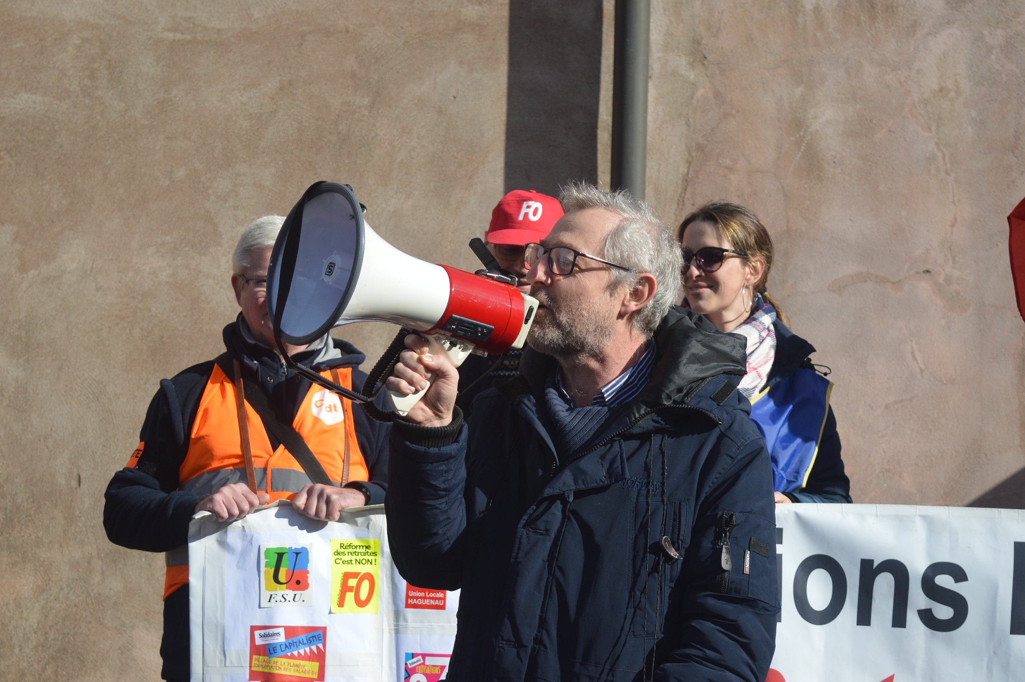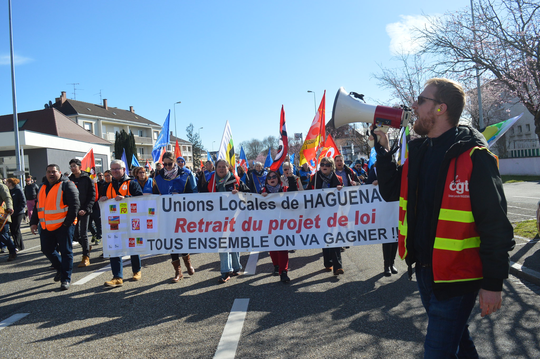 Place de la gare à Haguenau, un peu moins d’un millier de personnes se rejoignent sous le soleil samedi 11 mars. « Le 21 février, on était 2 000. C’était la plus grande manifestation de l’histoire de la ville. Aujourd’hui on s’en rapproche », analyse Emmanuel Printz, président de l’union départementale de la CFTC et ouvrier chez Siemens, une usine située à quelques centaines de mètres.