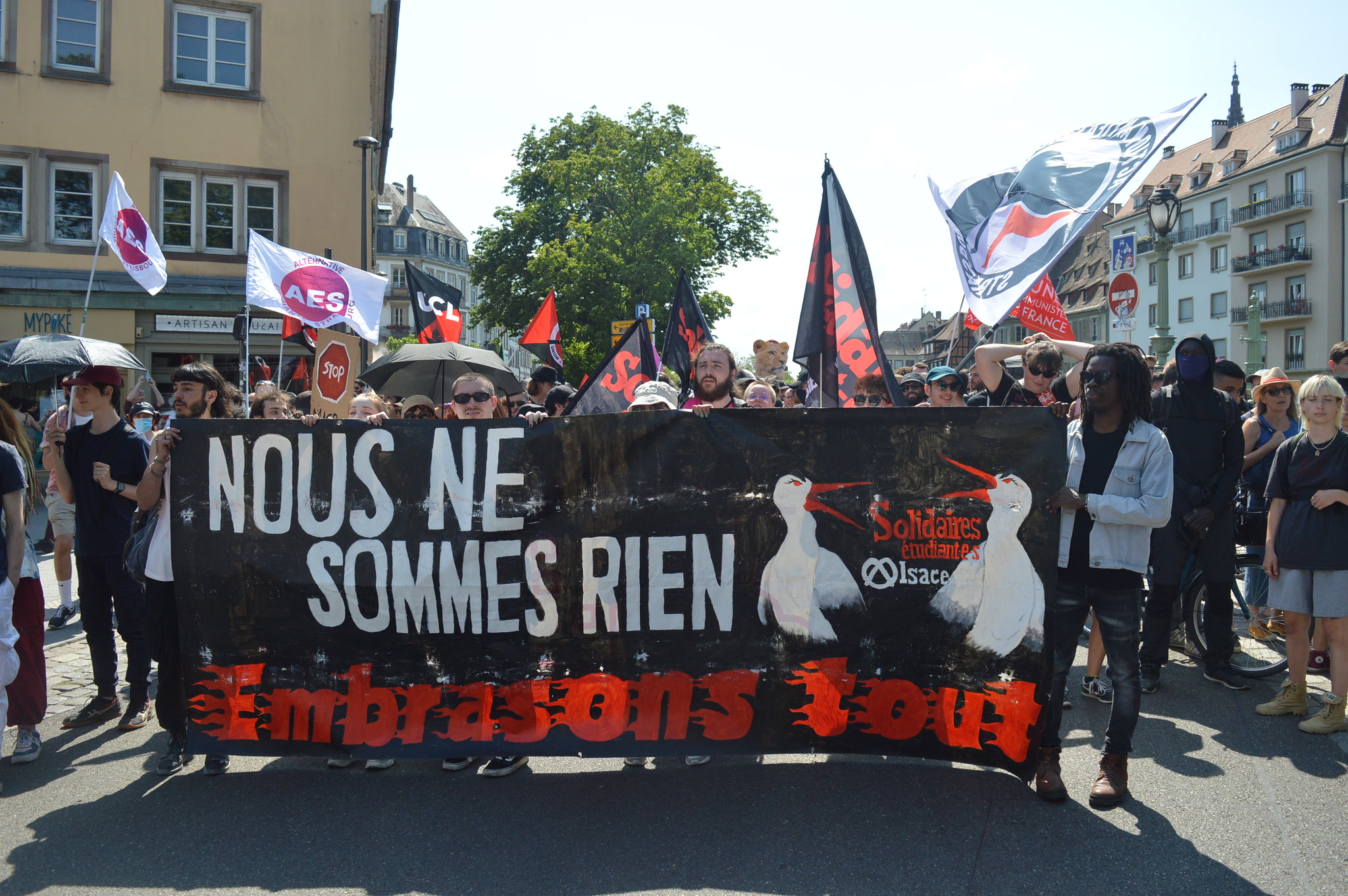 Tout devant, la foule est plus compacte et entonne « ni patron, ni patrie, ni patriarcat ». De nombreux jeunes avancent au rythme d’un ensemble de percussions. « Ce n’était pas du tout une bonne idée de ne rien faire pendant un mois. Il y avait énormément de gens en manif. Il fallait continuer pour profiter de la dynamique qu’il y avait en avril », souffle un jeune homme. Philippe Gueth, de la CFDT Santé sociaux, explique quant à lui que l’intersyndicale n’avait « pas d’autre choix que de faire une pause » : « Beaucoup de salariés auraient arrêté de suivre les mobilisations parce qu’ils n’auraient pas réussi à suivre financièrement. C’est le retour qu’on a de certains adhérents. »