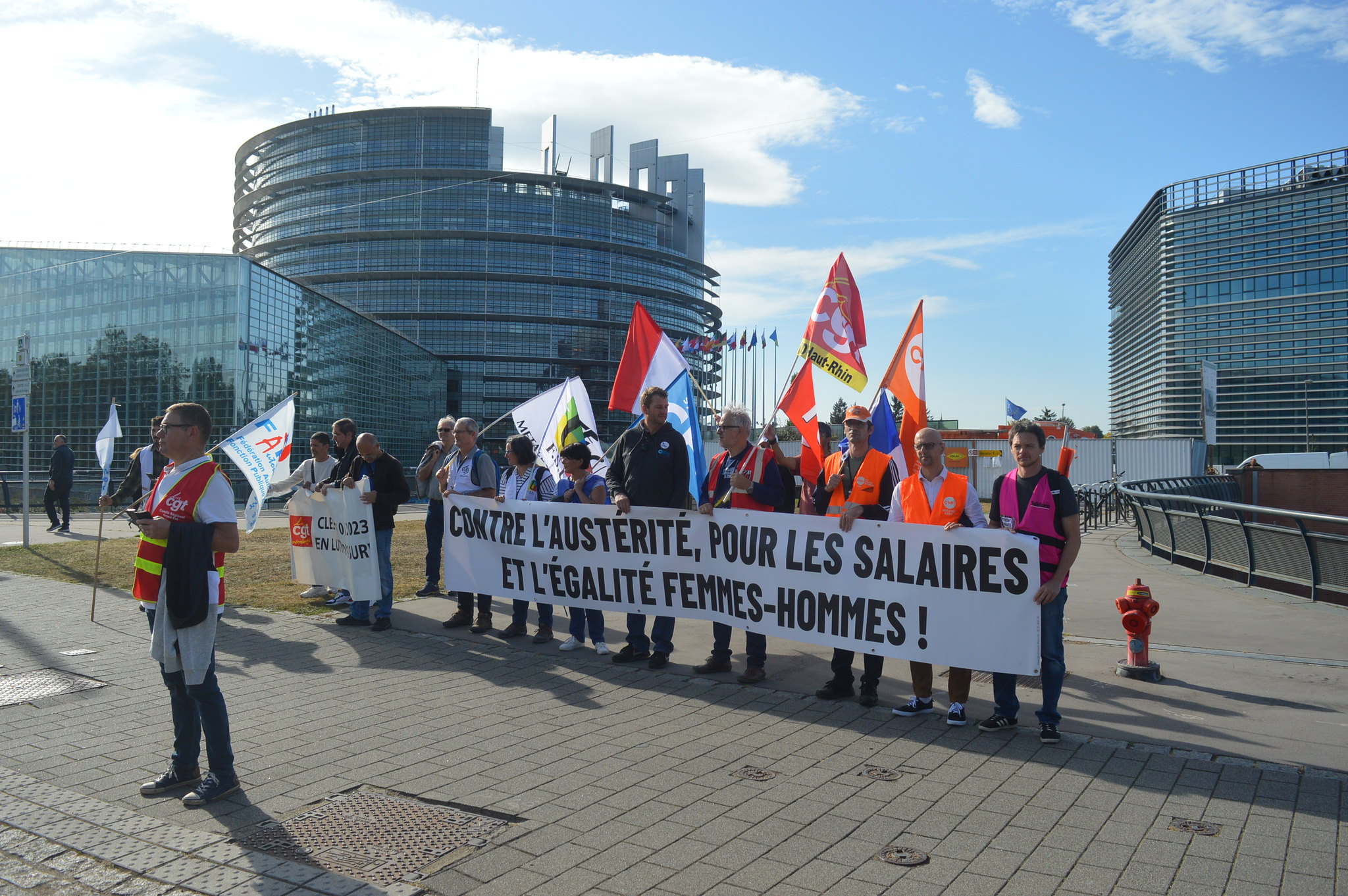 Arrivés devant le Parlement européen, protégé par un dispositif policier, des représentants des syndicats prennent la pose devant l’imposant bâtiment avec leur banderole : « Contre l’austérité, pour les salaires et l’égalité femmes-hommes. » La date de la prochaine mobilisation n’est pas encore fixée selon Laurent Feisthauer.