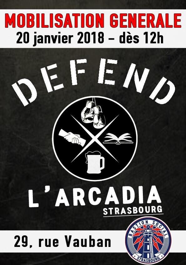 Le Bastion Social, installé depuis le 9 décembre à Strasbourg, donne rendez-vous devant l’Arcadia dès 12 heures pour « défendre » le QG du groupuscule d’extrême-droite, dont le trésorier de l’association a été condamné à huit mois de prison ferme pour l’agression d’un jeune d’origine algérienne, comme Rue89 Strasbourg l’a révélé.