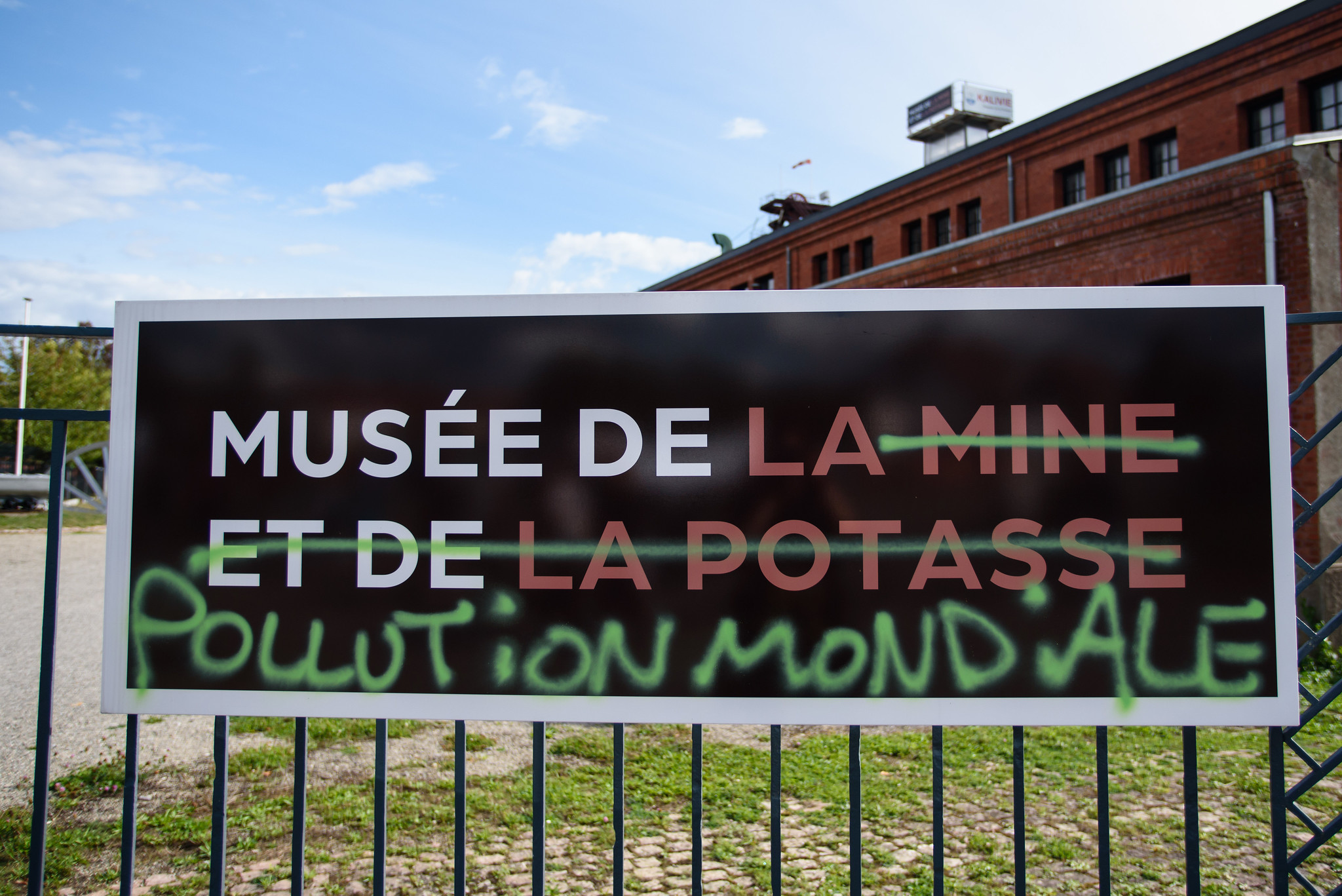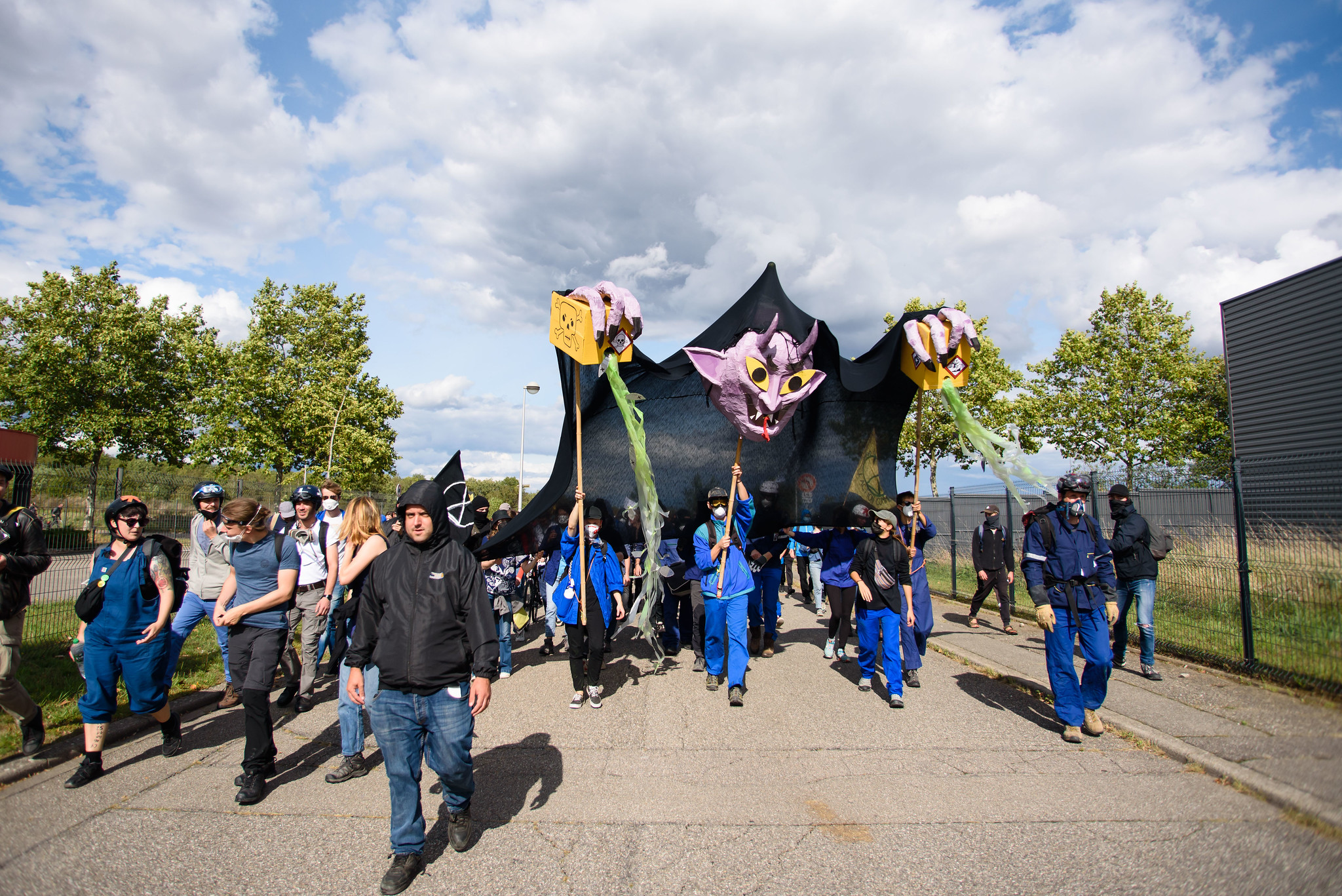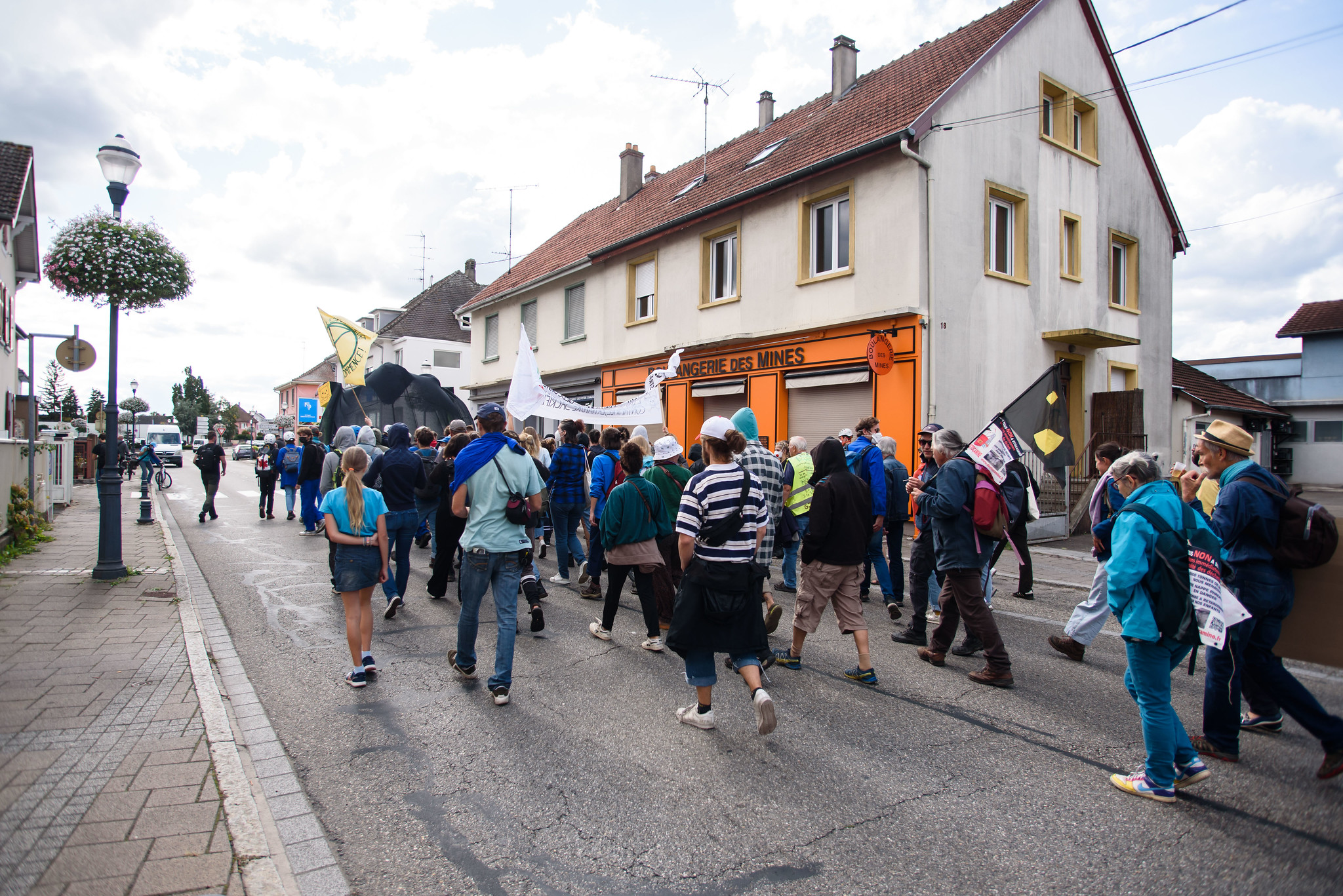 Des gendarmes encerclent tout le rassemblement. Un hélicoptère survole la place, au-dessus de manifestants éberlués par l’impressionnant dispositif des forces de l’ordre. Alors que la manifestation déclarée touche à sa fin vers 14h, un militant prend la parole pour suggérer une « déambulation pacifique ». Une centaine de personnes se mettent en route vers l’entrée de la mine de potasse, quelques kilomètres plus loin, avec une marionnette de démon qui tient des déchets toxiques en guise de banderole de tête. À l’aide de bombes de peinture, des tags hostiles au confinement des déchets sont inscrits sur des arrêts de bus et des panneaux publicitaires.