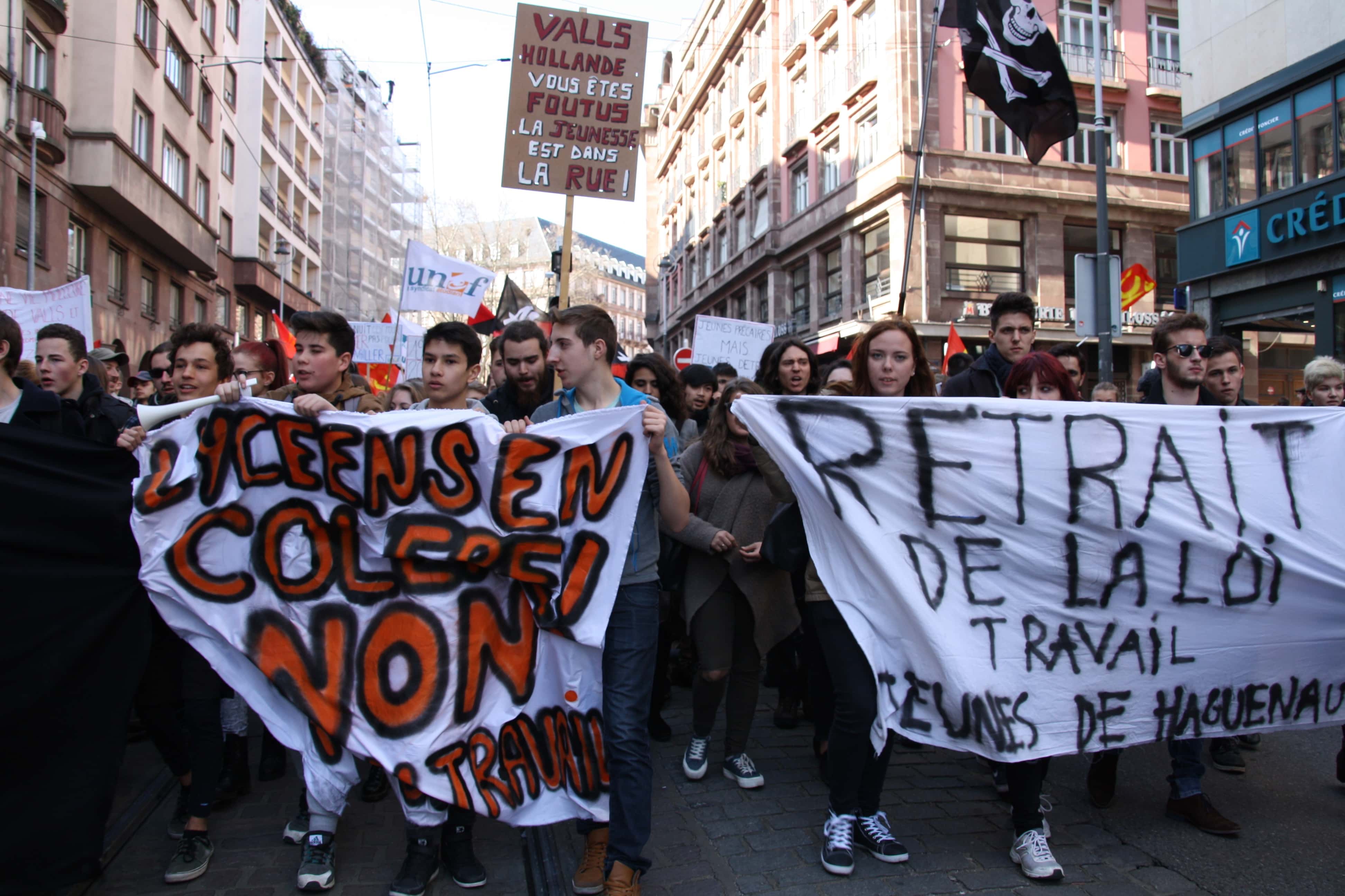 Le mouvement des Jeunes Communistes, le mouvement des Jeunes Socialistes, Europe Ecologie – Les Verts, la CGT, le Nouveau Parti Anticapitaliste ont répondu à cet appel national, relayé par l’UNEF à Strasbourg. Sur certaines pancartes, on pouvait lire des messages plus ou moins drôles ou alarmistes : « la nuit c’est pour s’aimer, pas pour travailler », « nous sommes trop mécanisés et nous manquons d’humanité (Chaplin) » ou encore « 1916 : Chair à canon. 2016 : Chair à patron ».