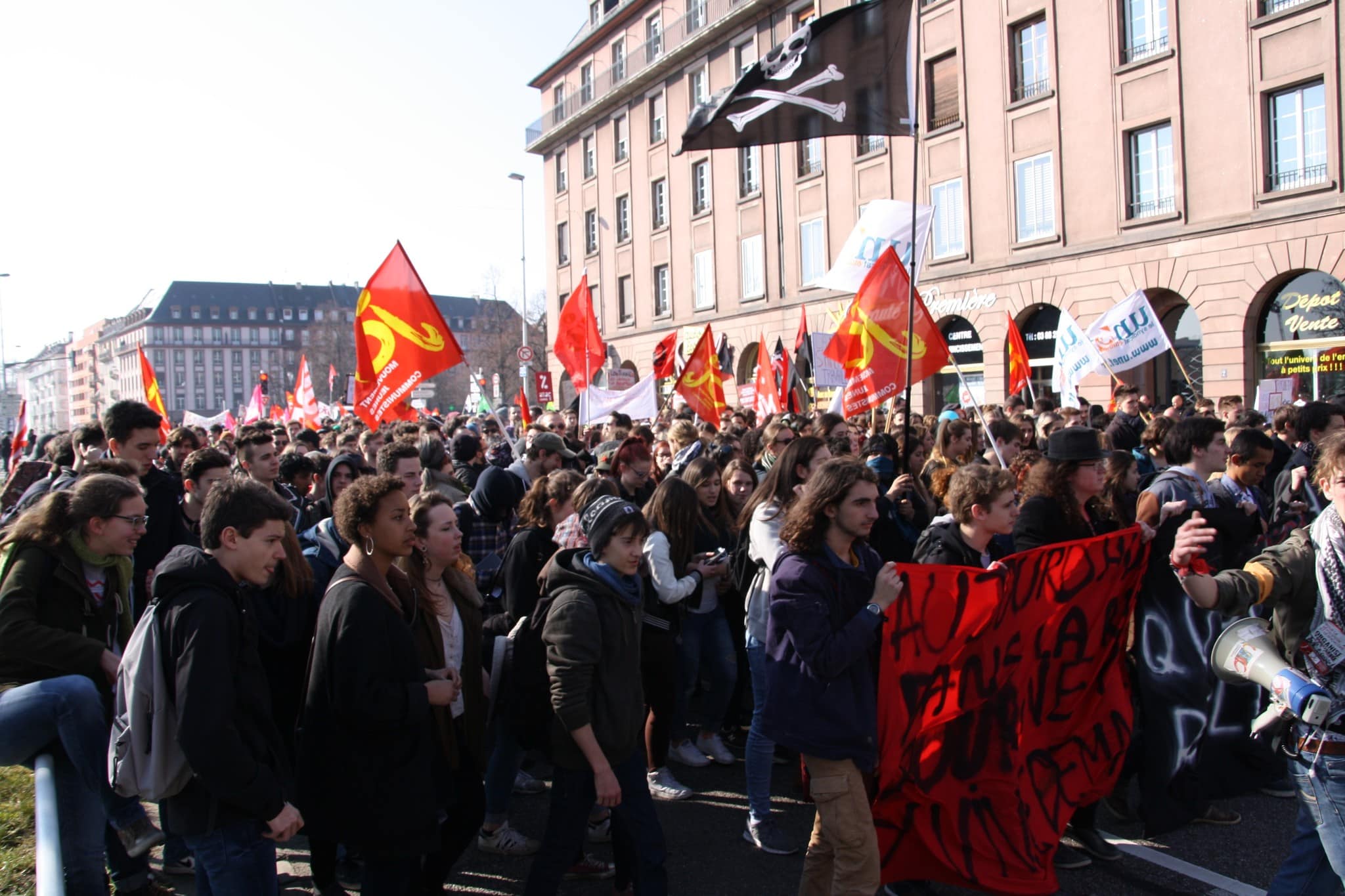 Équipés de leurs drapeaux et d’autocollants rouges, les étudiants ont été accompagnés par une camionnette de la CGT au rythme du slogan : « Strasbourg, réveille-toi ! ». Le cortège a poursuivi sa route jusqu’aux lycées Jean Rostand et des Pontonniers avec l’ambition d’embarquer les lycéens dans la manifestation.