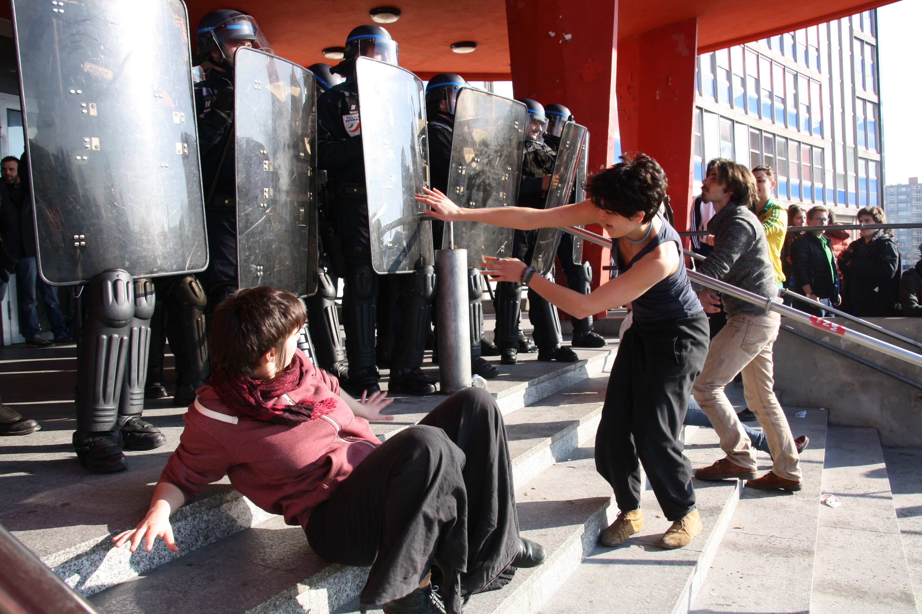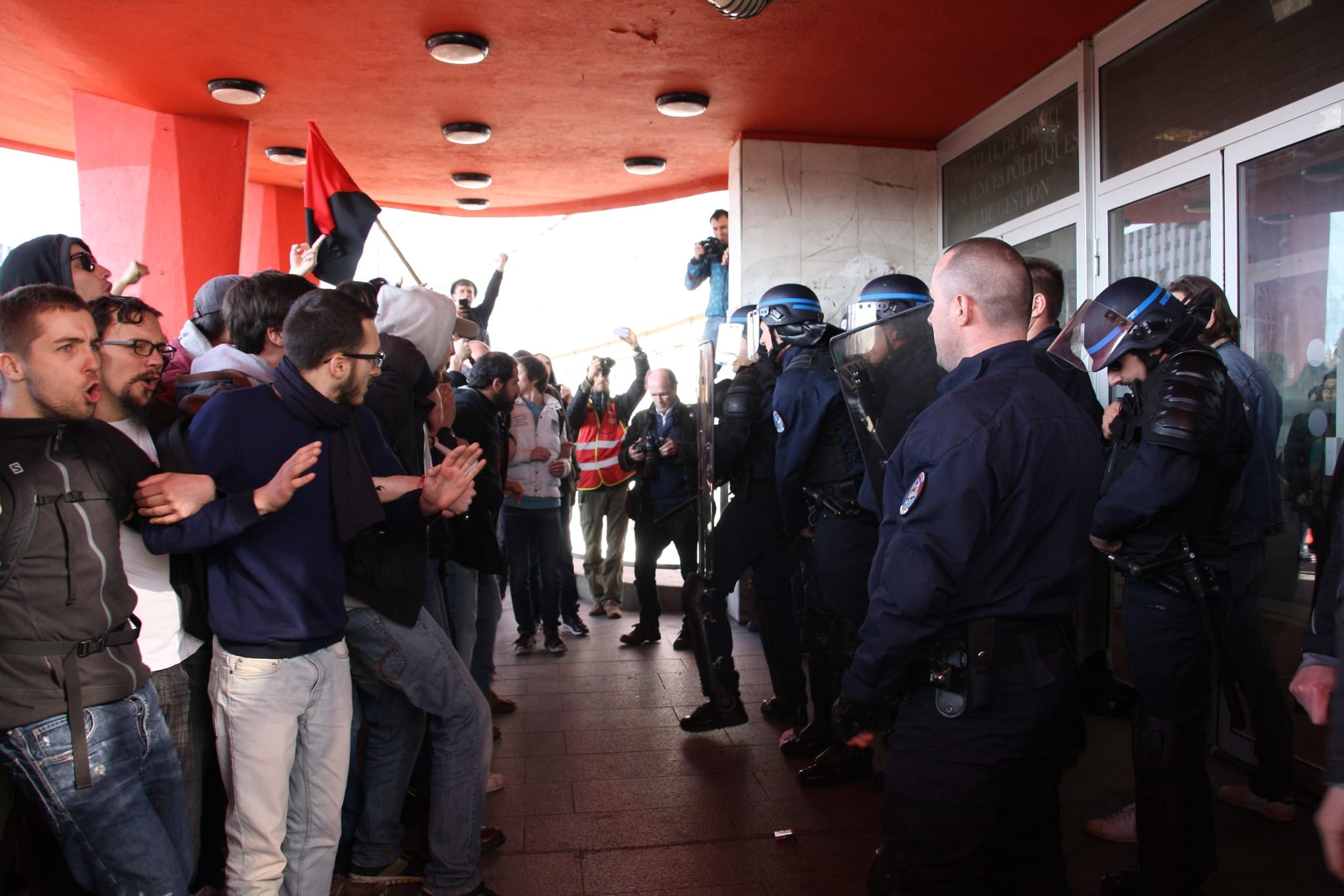 Les manifestants ont terminé leur trajet sur le campus de l’Université vers 15h30, devant le bâtiment de la Fac de Droit. Mais voulant s’y réunir, ils ont trouvé les portes closes et gardées par un barrage de policiers en tenues d’intervention. Certains ont tenté de forcer le barrage, violemment repoussés par les policiers à coups de matraques et de tirs de gaz lacrymogènes. Les échauffourées ont fait entre trois et cinq blessés légers, une lycéenne blessée par la tête a reçu cinq points de suture. Octave, étudiant en médecine :