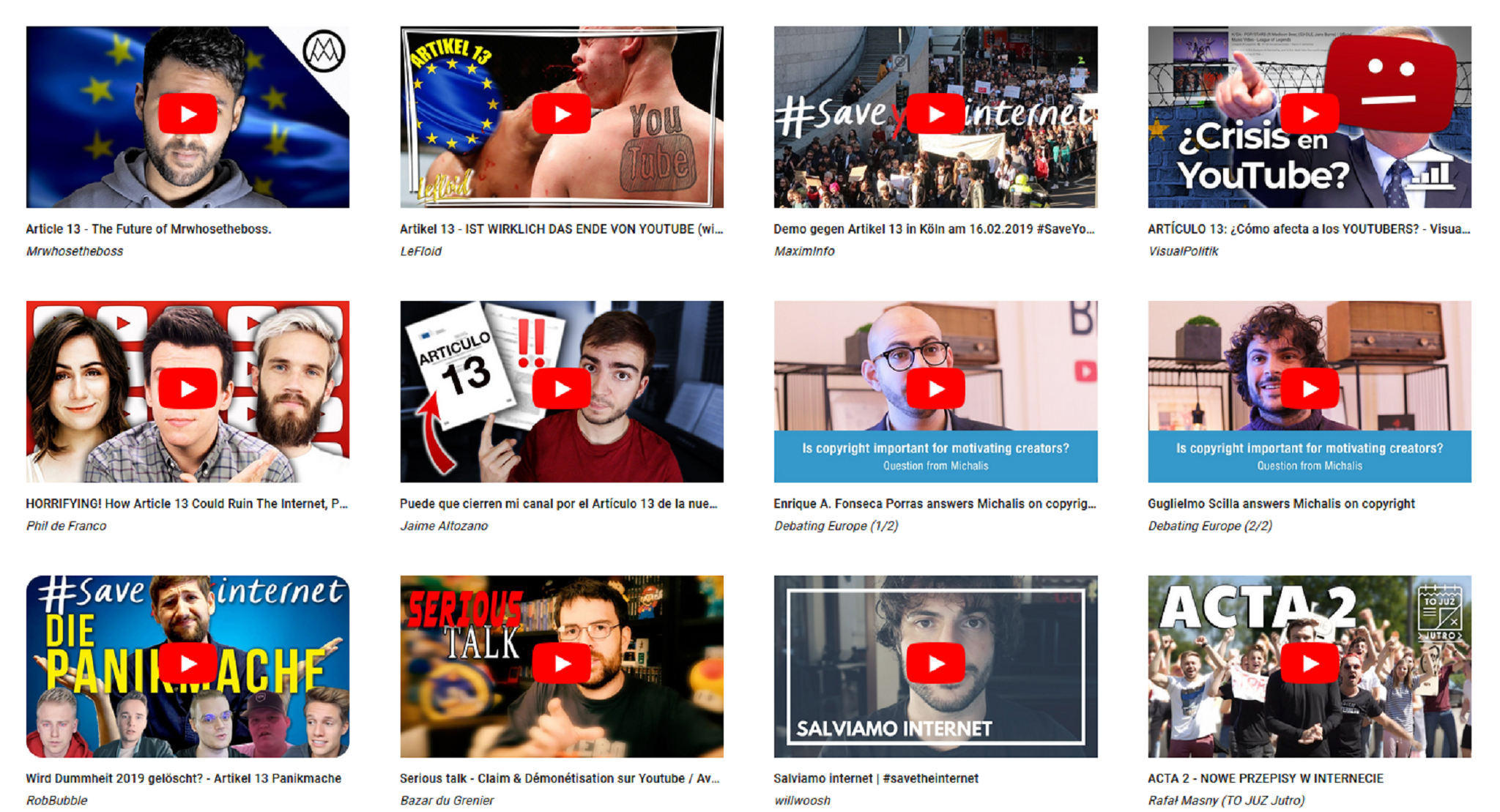 Youtube s’est farouchement prononcé contre cette directive. Avec la campagne #SaveYourInternet, la plate-forme a mobilisé de très nombreux youtubeurs afin d’engager leurs communautés contre la directive. Le géant du net a présenté le texte comme impliquant la fermeture de Youtube en Europe et a invoqué la liberté d’expression. Mais le mouvement 404 Creators not found, qui sera présent devant le Parlement demain matin, dénonce l’hypocrisie du site web, indiquant que « Youtube a supprimé 8,7 millions de vidéos entre septembre et décembre 2018 pour se conformer aux désidérata de ses annonceurs. »