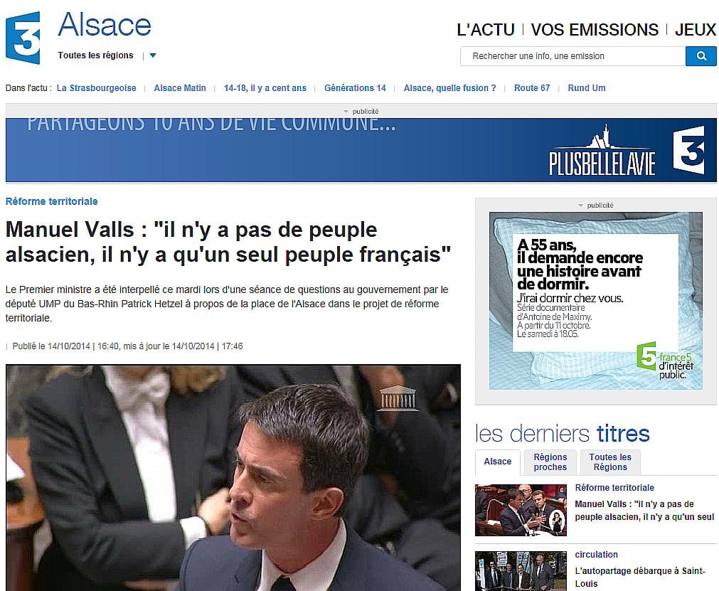 Le site de France 3 Alsace revient sur l’échange à l’Assemblée nationale qui a opposé le député UMP du Bas-Rhin Patrick Hetzel et le Premier ministre, Manuel Valls, dans l’après-midi du 14 octobre. Le représentant de la circonscription de Saverne voulait s’assurer que Manuel Valls n’ait jamais dit qu’une « Alsace seule serait une Alsace repliée sur elle-même » comme l’aurait indiqué le député Philippe Bies (PS). Des propos qui auraient créés « un très vif émoi » en Alsace, d’après le député de droite, rappelant au passage la manifestation du samedi 11 octobre d’opposition à la réforme territoriale et en faveur d’un Conseil unique d’Alsace (et en gonflant un peu les chiffres de participation).