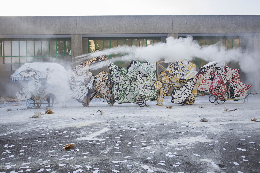 Le dessin géant Megafish raconte des voyages migratoires. Arkignol – contraction d’architecture et de guignol – se moque de tendances architecturales à grand renfort de costumes en carton et de pantomime. La performance Kiosk fait participer de jeunes artistes du quartier, qui se retrouvent habillés de nourriture ou dansant sur le parking désert d’Auchan. Les pulsions sont mises à jour : l’art permet de révéler une autre réalité, ici celle des désirs rentrés, de la consommation ou de l’affection frustrées.