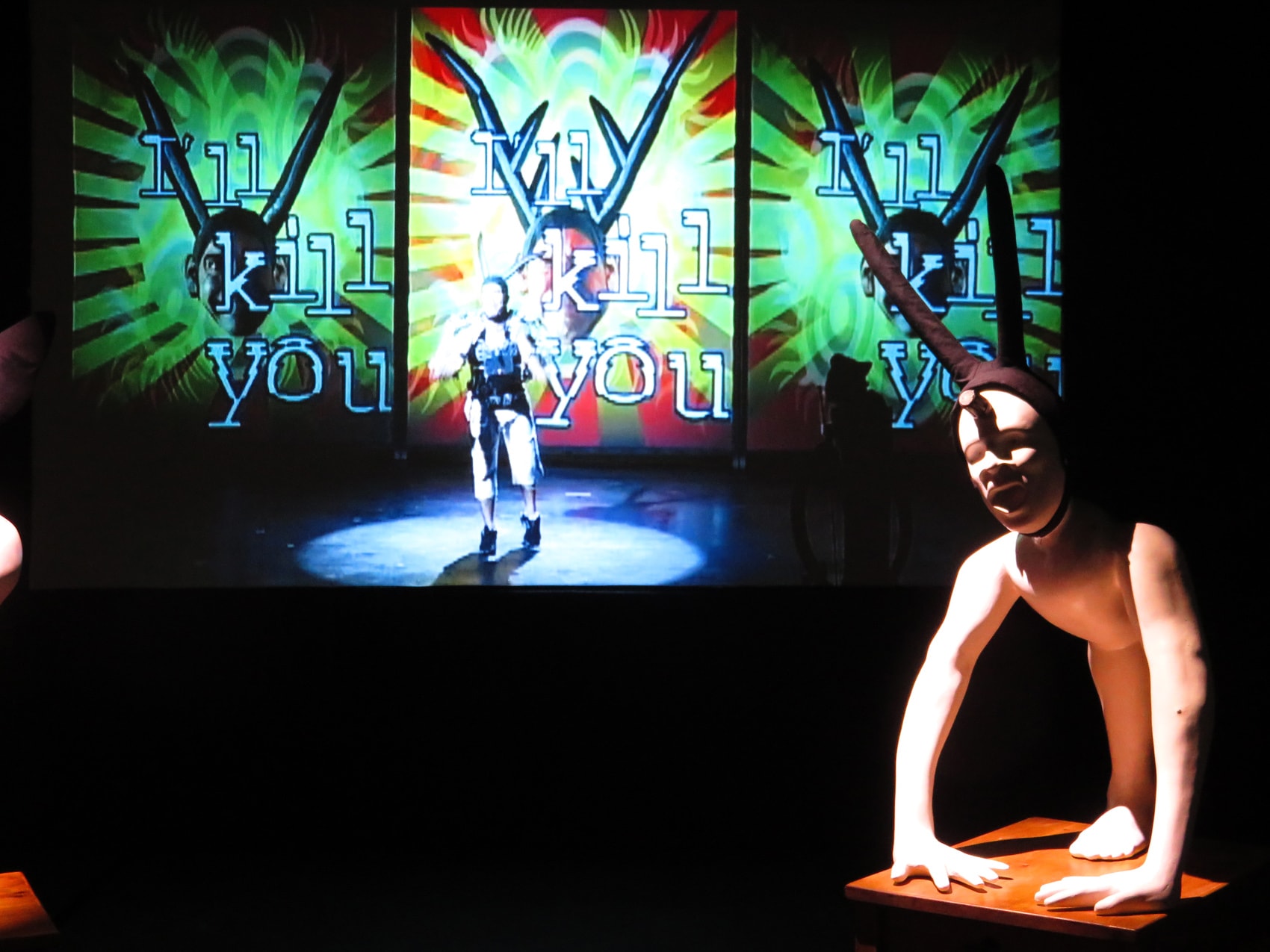 En montant dans la pénombre à l’étage du Shadok, quai Malraux à Strasbourg, on arrive d’abord dans une première partie de l’exposition qui plante le décor et présente l’artiste. Le personnage de Marcel Li Antunez vaut la peine que l’on s’y attarde un peu : figure de l’art catalan, il est connu au-delà de ses frontières depuis les années 90 pour ses performances où se télescopent une foultitude de concepts et d’influences, de Roberts Combas à la science-fiction, du folklore espagnol aux performances Fluxus des années 60.