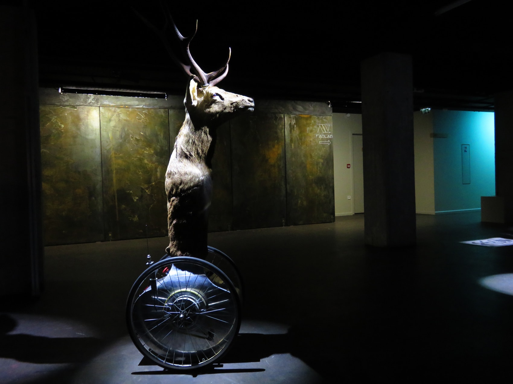 Marcel Li s’est fait connaître par la scène, œuvrant à la fois dans l’underground et dans le théâtre de rue avec sa compagnie Fura del Baus. Plusieurs de ses compagnons de scène sont exposés dans la première salle : des créatures robotiques faites de métal étincelant et d’animaux naturalisés, ainsi que des exosquelettes motorisés qui influent sur les mouvements de celui qui les porte.