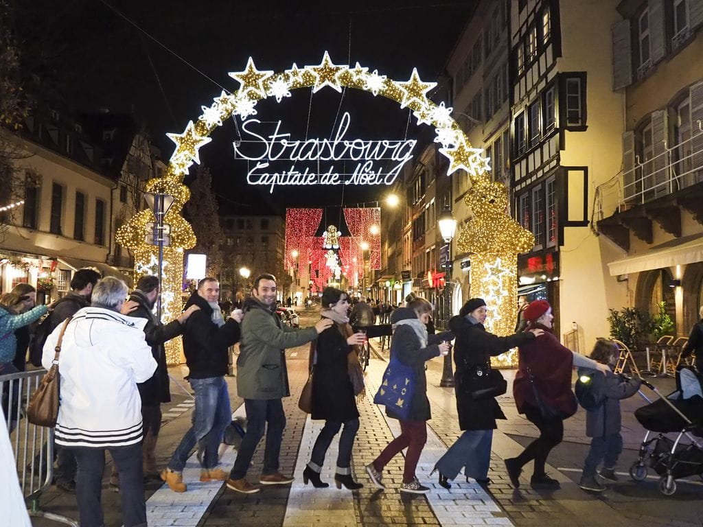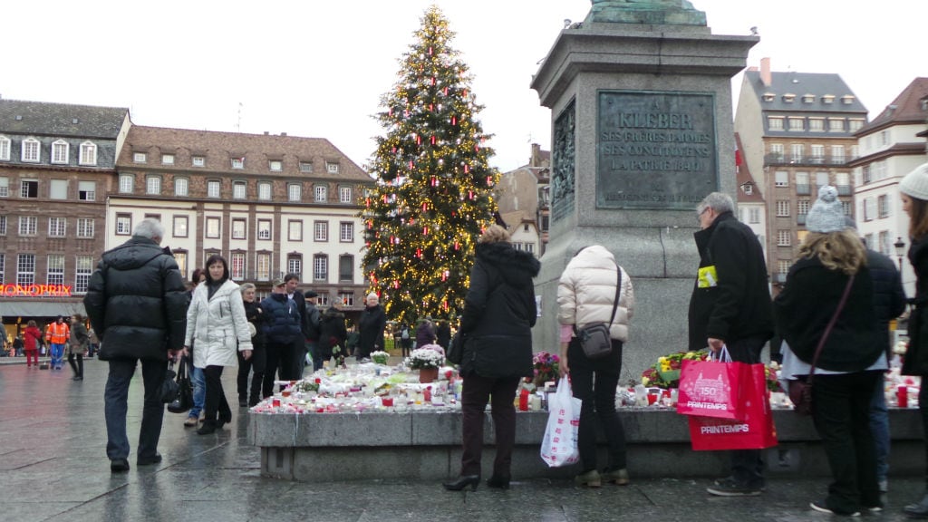 Sur la place Kléber, la statue du général de la Révolution transformée depuis les attaques parisiennes en lieu de recueillement à la mémoire des 130 victimes, attire autant les visiteurs que le grand sapin, illuminé quelques dizaines de mètres plus haut.