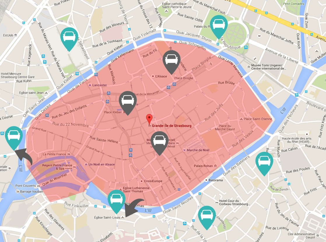 Ainsi, le service d’autopartage Citiz (anciennement Autotrement) se voit contraint de fermer trois stations (Kléber, Broglie et Gutenberg) et d’en déplacer deux de l’autre côté de l’Ill. Les voitures en libre-service Yea! ne pourront pas non plus être stationnées dans l’enceinte de la grande île.
