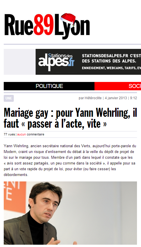 Yann Wehrling , ancien secrétaire national des Verts et actuel porte-parole du Modem ainsi que président du Modem Alsace, appelle sur son blog à un vote rapide du projet de loi sur le mariage pour tous. Pour lui, il faut faire cesser les dérives du débat qui risquent d’enterrer le projet. Il s’agit de recentrer le débat sur la question du droit à la différence plutôt que sur l’adoption qui catalyse les peurs.