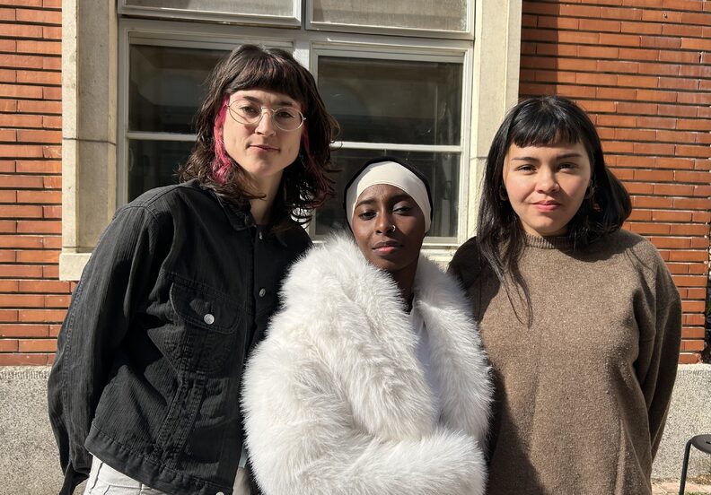 L’artiste mahoraise Bouchrat, entourée de Valentine Coqueron élève à la HEAR et de My Lan Sourisseau, élève à l’ENSATT. Photo : Fanny Laemmel / Rue89 Strasbourg