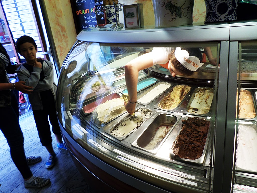 Chaque sorbet contient son propre sirop, travaillé à la casserole. Les fruits sont commandés chez un grossiste, et les gousses de vanille de Madagascar. Le chocolat est aussi fait maison. Pour une boule de glace à emporter, il faut compter 1,50€, et 20 centimes de plus sur place. C’est glacier le moins cher de notre sélection. Un groupe de jeunes installés à une table attendent tranquillement leurs glaces :