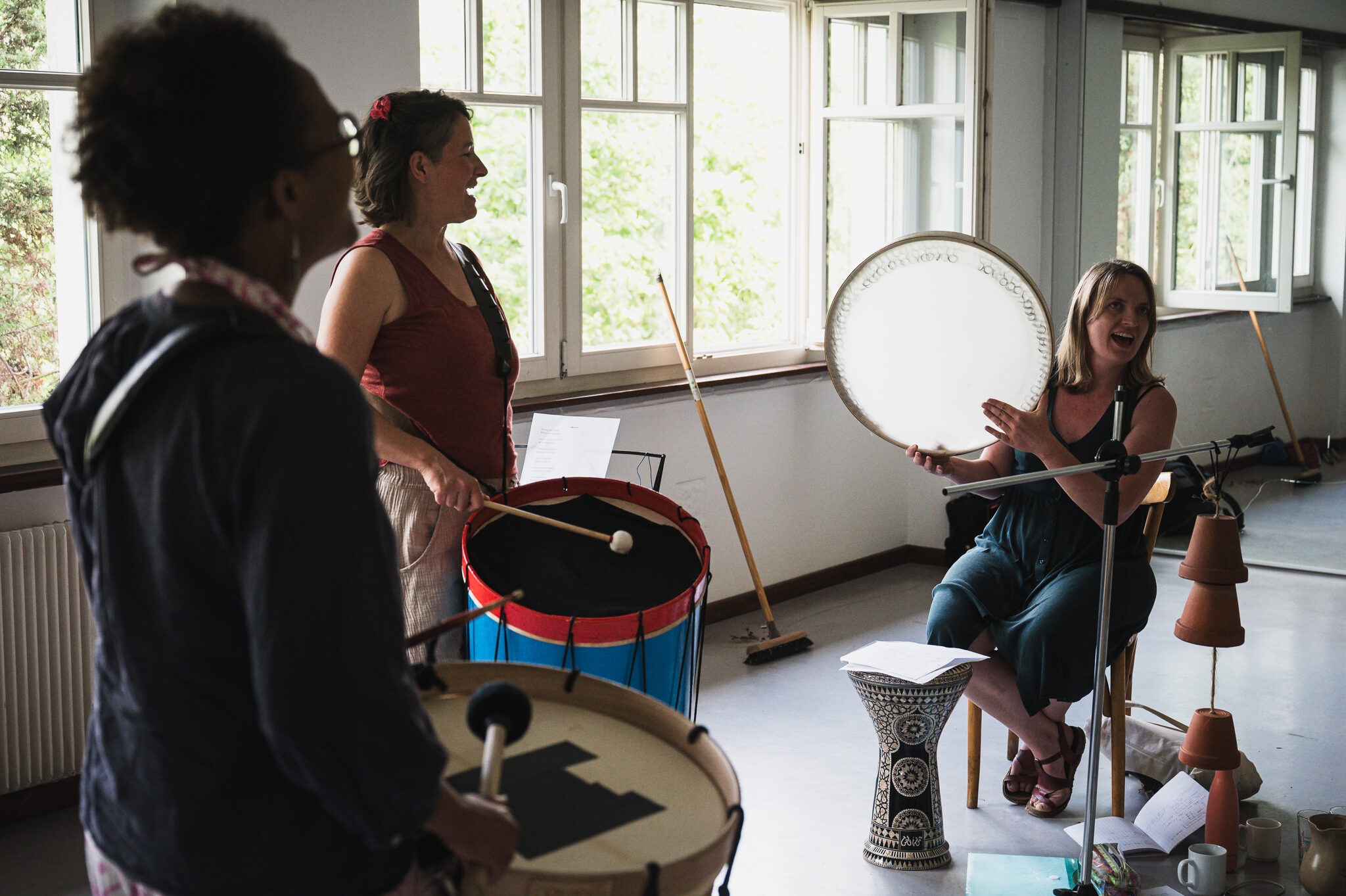 Ils sont une vingtaine en cette semaine du mois de juillet. Ici, une comédienne travaillant son texte, là, un musicien enchaînant quelques accords. Plus rarement, on croise un bénévole de l’association. Les artistes s’organisent librement. « On s’approprie un cadre qui est devenu familier », témoigne Claire Robert, membre du groupe de chants traditionnels À Hue et à Dia, habitué d’ARToPie. « En fin de répétition, on va donner un coup de main pour le ménage, même pour des choses qui ne nous concernent pas. » Et une autre membre du groupe, Alexandrine Guedron, de poursuivre : « On fait notre cuisine, on s’installe. Il y a quelque chose de très familial ici. »