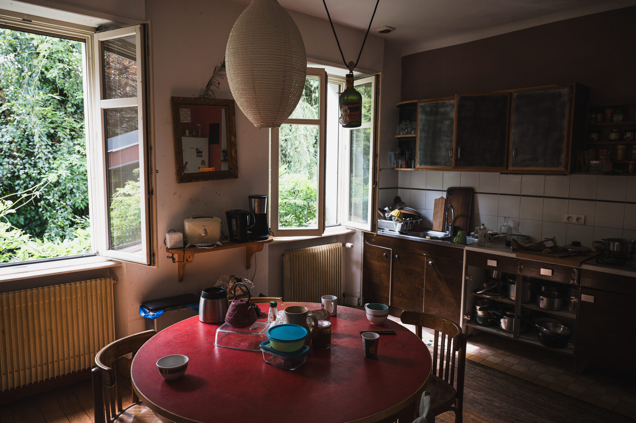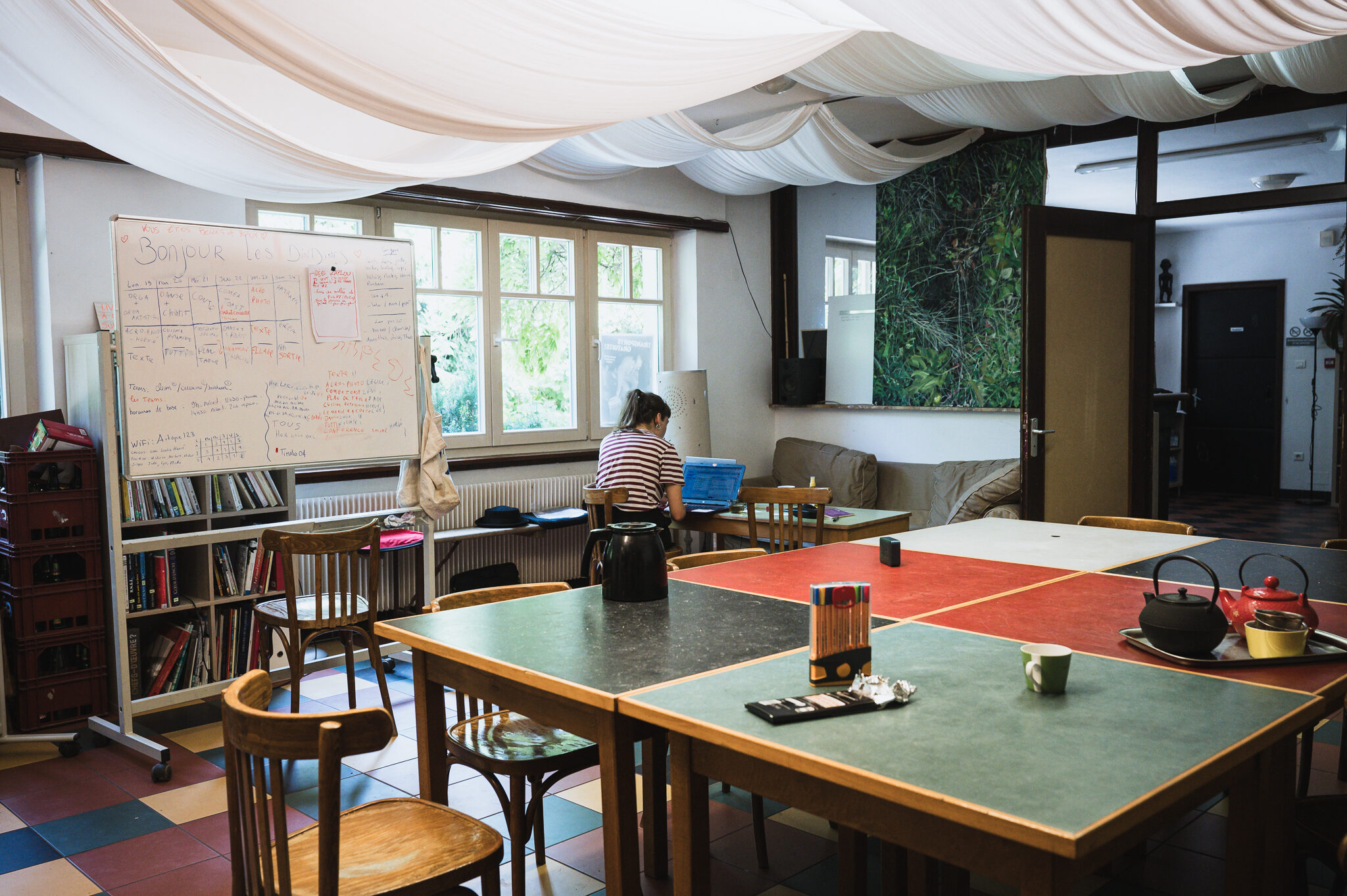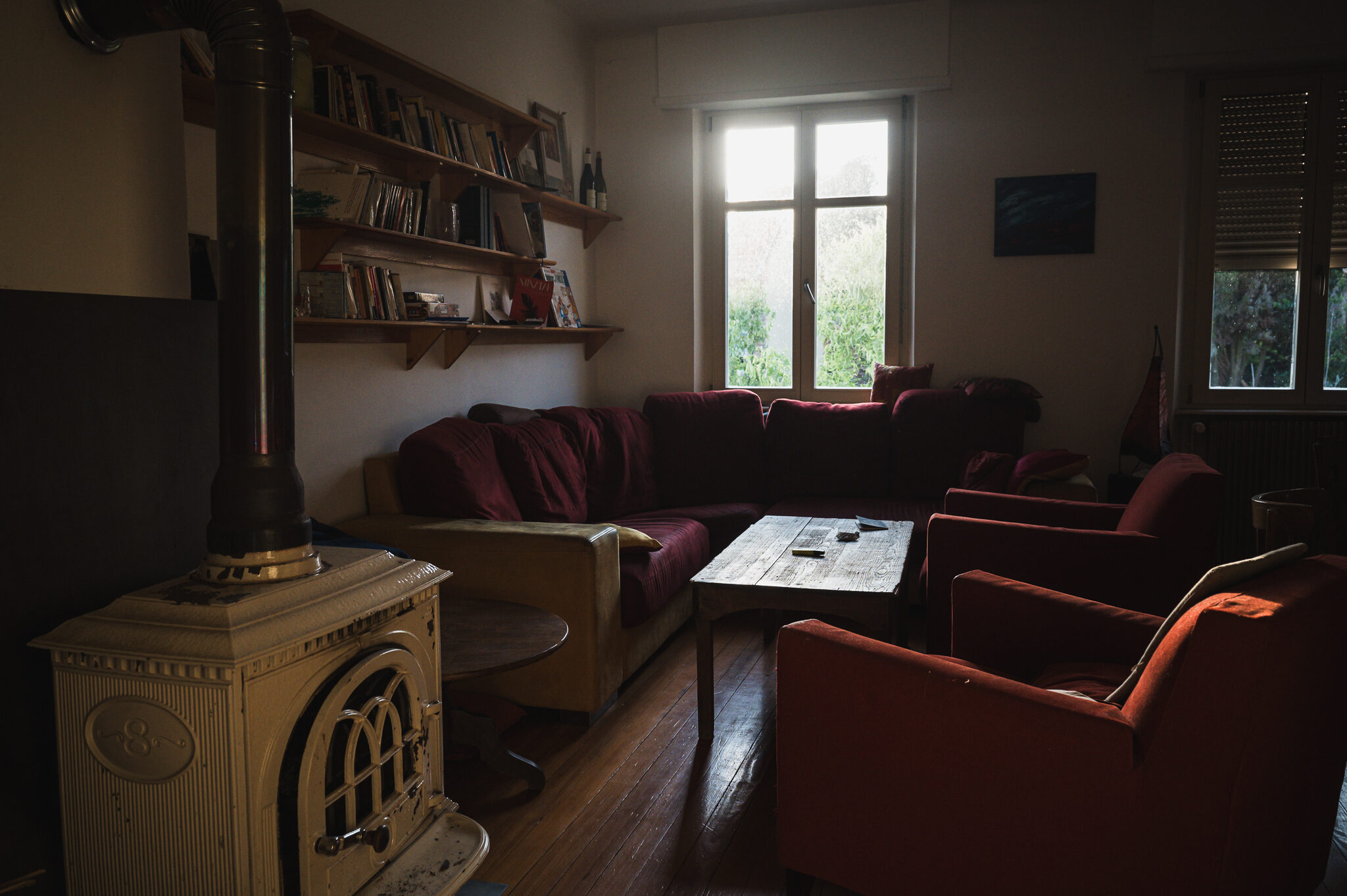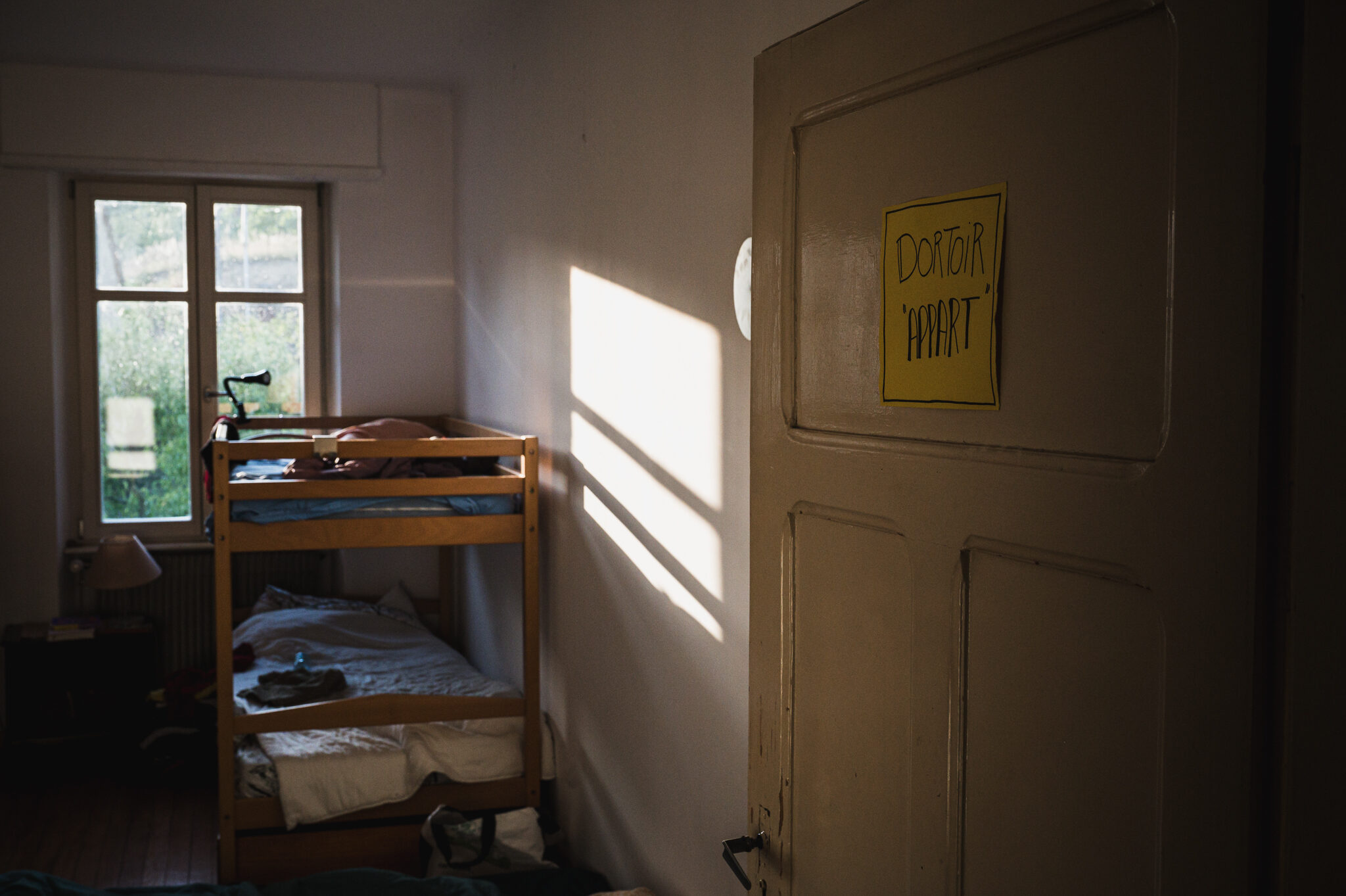 Venues de Strasbourg, les trois membres du collectif d’arts visuels vivent dans les étages du bâtiment pendant leur semaine de résidence. Seul un escalier et quelques portes séparent l’atelier de l’espace d’habitation. En haut, plusieurs chambres, des dortoirs collectifs, un salon, une cuisine et une salle de bain. Sans le grand tableau récapitulatif de l’occupation des chambres, et la tirelire « prix libre » pour la machine à laver, on pourrait se croire dans n’importe quelle colocation strasbourgeoise.