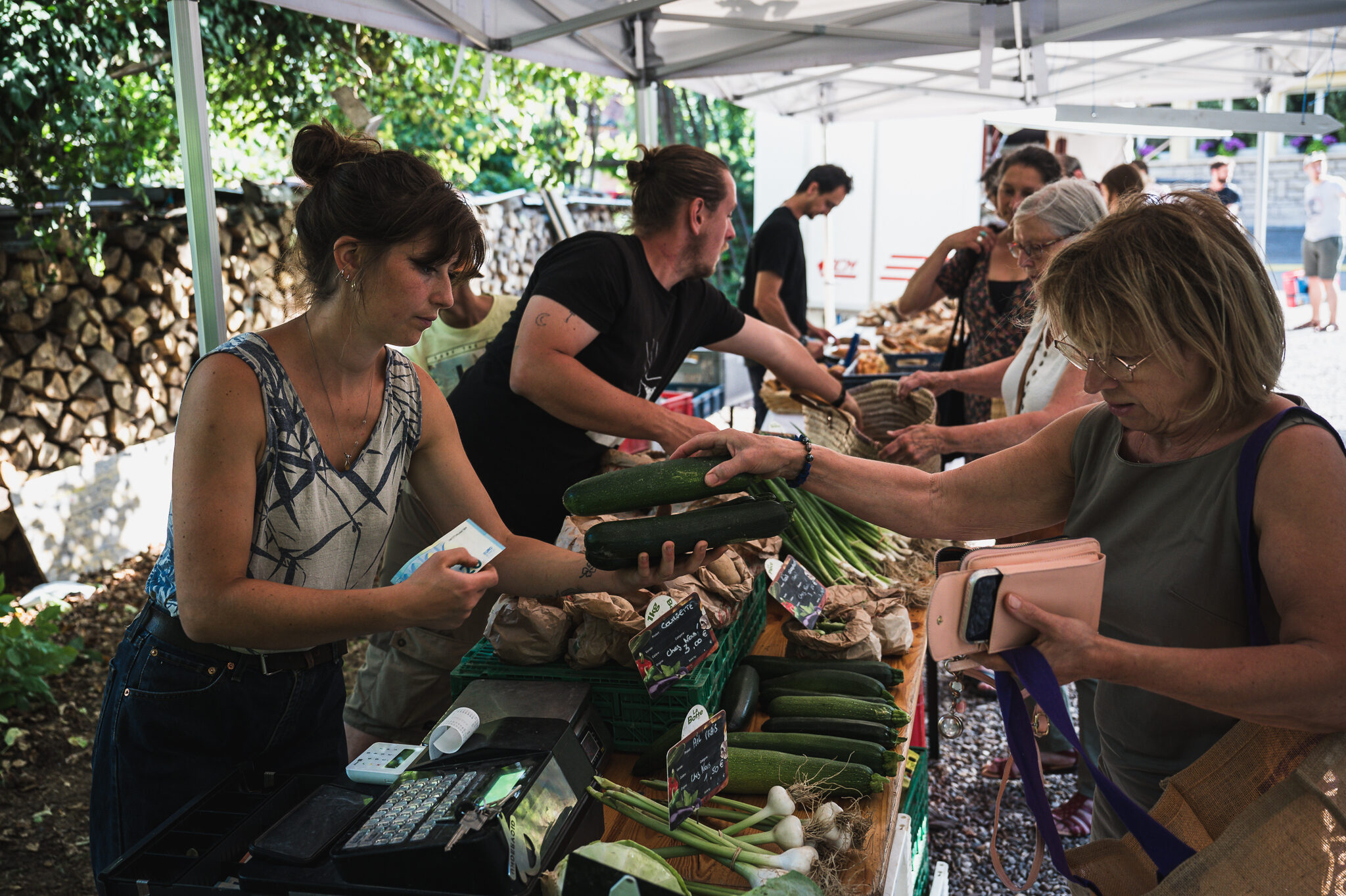 Le jeudi à ARToPie, c’est jour de marché. Dans la cour, une foule nombreuse se presse devant les étals. De la viande crépite sur un barbecue. Dans un coin, deux mamies se racontent les derniers potins du village. Malicieuses. Derrière la buvette, Daniel Maréchal, un bénévole, observe l’affluence : « Ici, on crée du lien social, il y a des gens de tous les milieux. » À côté, ses courses en main, Céline Senger commente :
