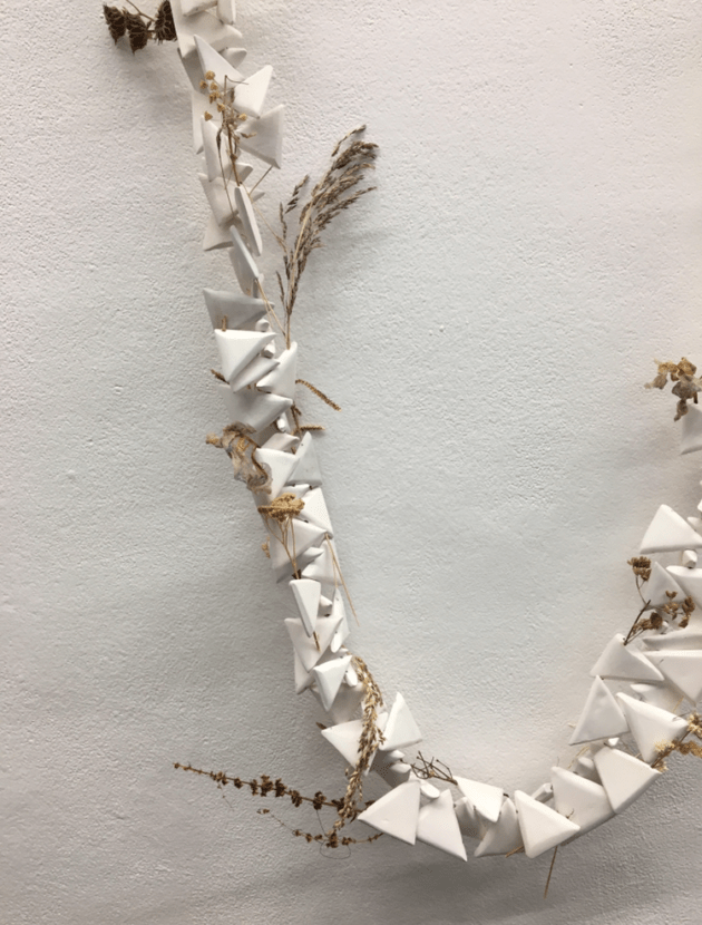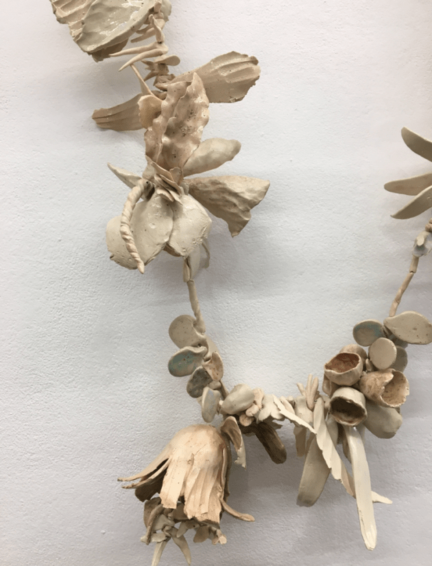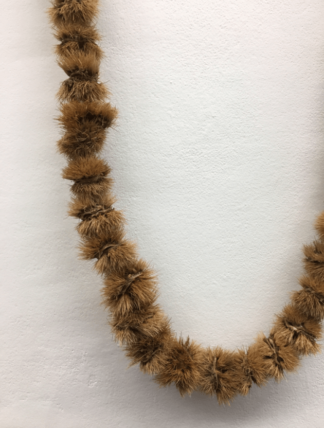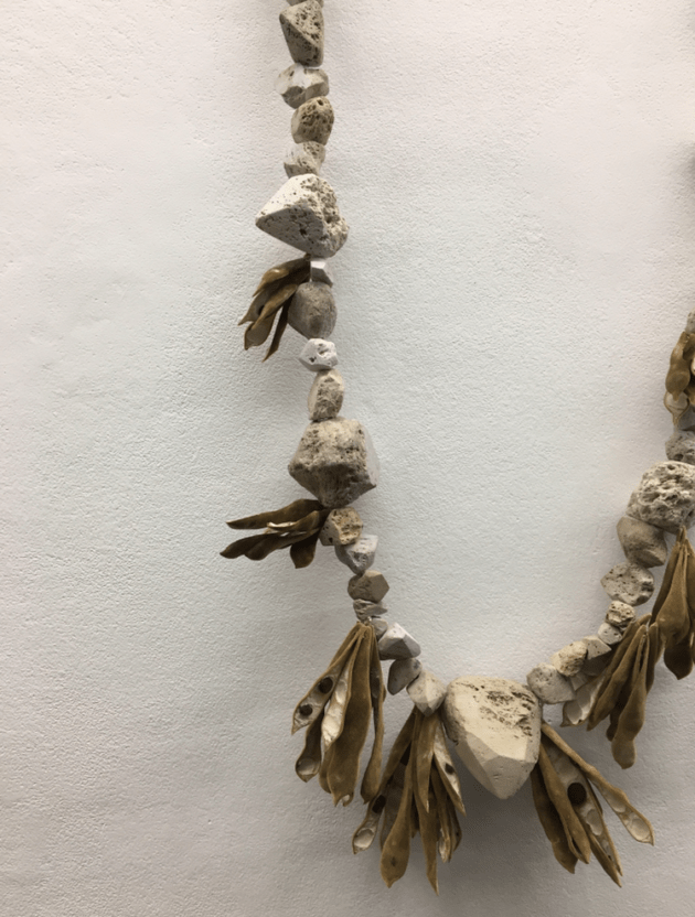 Spiritualité et divinités animistes viennent ensuite envahir l’entièreté d’une cimaise blanche, ornée d’immenses colliers pour l’occasion (Le Grandi Sorelle). Parés d’éléments naturels, comme des coquillages, fleurs, bogues de châtaignes, terre ou encore pierres ponces, ces colliers tendent à rappeler les premières créations ancestrales, où l’énergie de la nature se transformait en ornement spirituel.