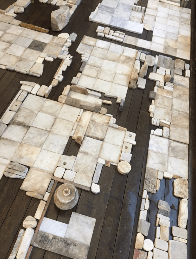 L’ancien magasin prend alors des allures de maison, voire presque de palais romain où renaissent, dans un enthousiasme collectif, des savoir-faire et traditions vernaculaires. Le travail des ouvrières de Nove est honoré dans un assemblage de mosaïque de grès décorée de fleurs, d’insectes, ou de motifs plus abstraits (Pavimento (Per Clarice)) ; et plus loin, des marbres de tailles et couleurs différentes, déposés les uns à côté des autres, rappellent tout autant un plan urbain, que le sol luxueux des anciennes villas romaines.