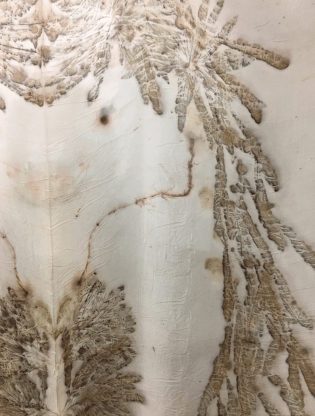 L’espace domestique, ouvert et étendu au rez-de-chaussée du CEAAC, se referme quelque peu le temps d’une expérience plus intime avec Senza Titolo (Una Tenda). Sorte de cabane circulaire à la structure de laiton, recouverte de longs rectangles de soie, l’œuvre invite au recueillement, seul.e ou à plusieurs. Sur le tissu, des figures mi-humaines, mi-végétales regorgent de marques poétiques obtenues par impression de végétaux. Cet espace hors du temps émerveille par sa beauté et sa délicatesse. Encerclé.e.s par ces êtres, l’atmosphère en devient presque mystique.
