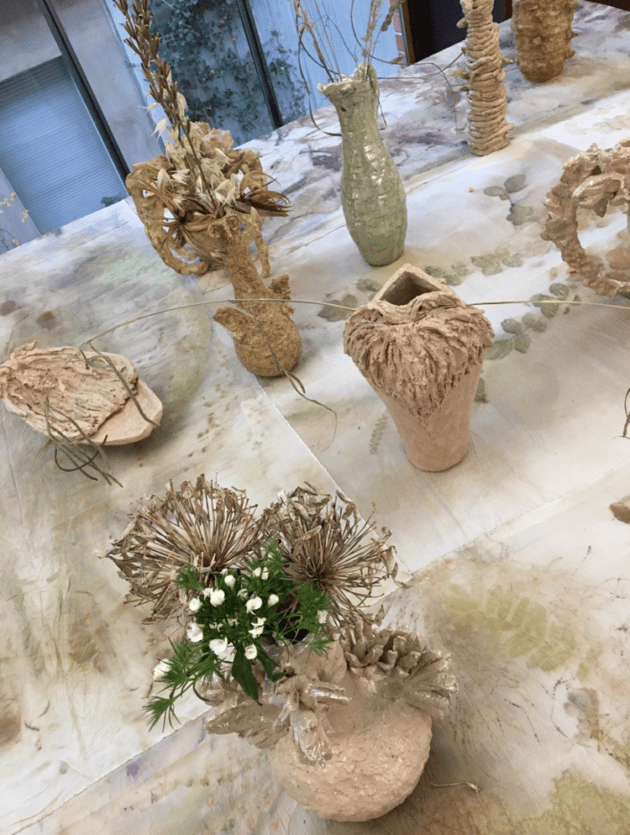 En montant à l’étage, les visiteurs franchissent un nouveau pas dans l’intimité du quotidien. Sur une table faite de planches et de tréteaux, recouverte d’un autre tissu imprimé de végétaux, trône une série de vases aux formes mystiques (Vasi Farfalle). Créatures extraordinaires, entre figures anthropomorphes et animales, ils sont le symbole de la féminité qui préserve ce qu’on lui confie. Cette réinterprétation des vases canopes de l’Égypte antique remplace les organes habituellement conservés à l’intérieur par des fleurs, fraîches ou sèches, collectées localement.