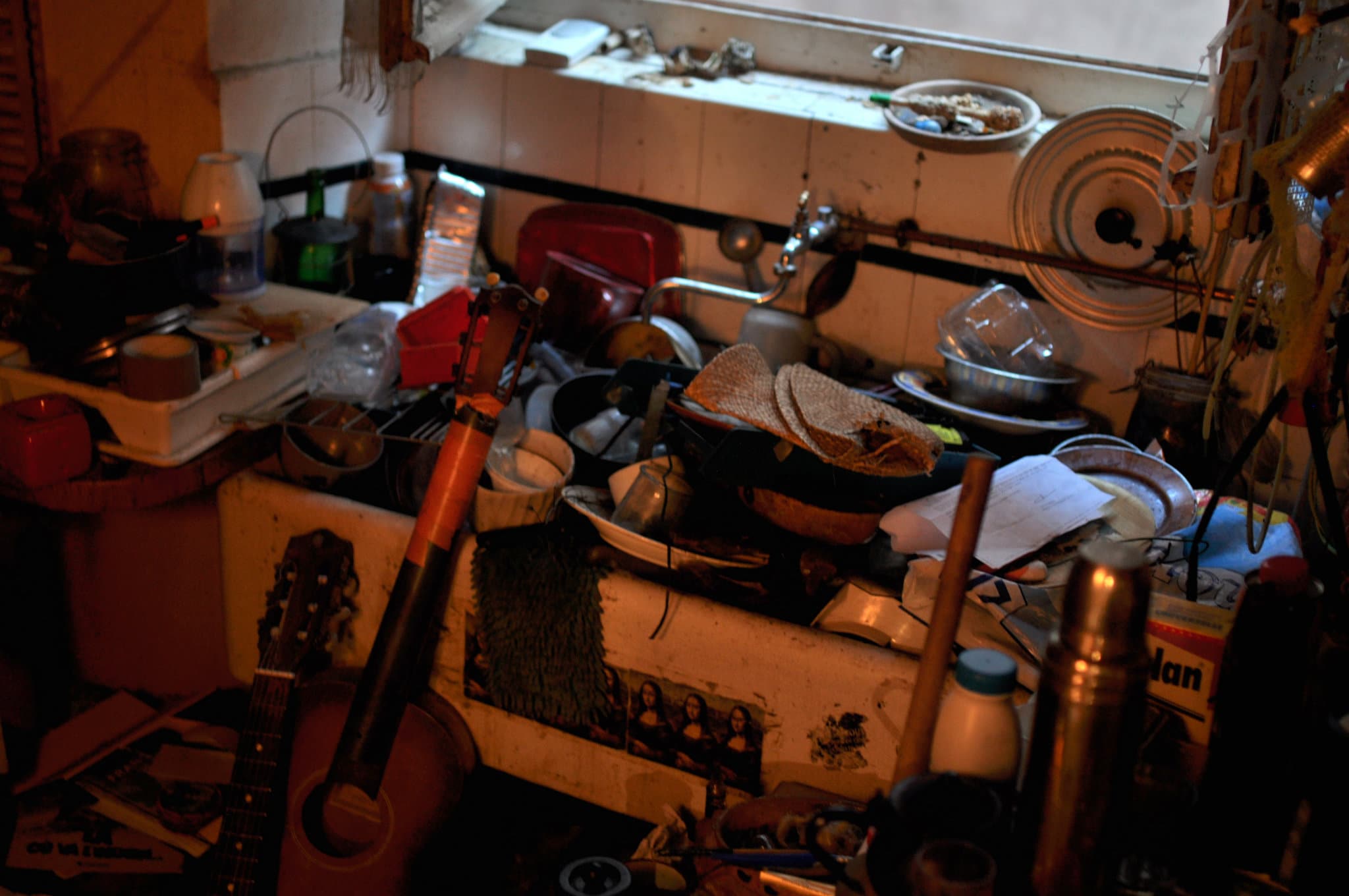 La vaisselle est laissée à l’abandon chez Michel, il préfère cuisiner sur sa petite terrasse. (Photo Tania Gisselbrecht / Rue89 Strasbourg)