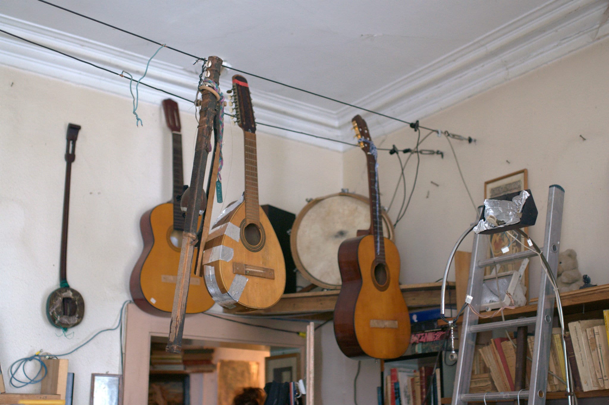 Michel possède plus d’une soixantaine d’instruments de musique, au plafond comme au sol ! (Photo Tania Gisselbrecht / Rue89 Strasbourg)