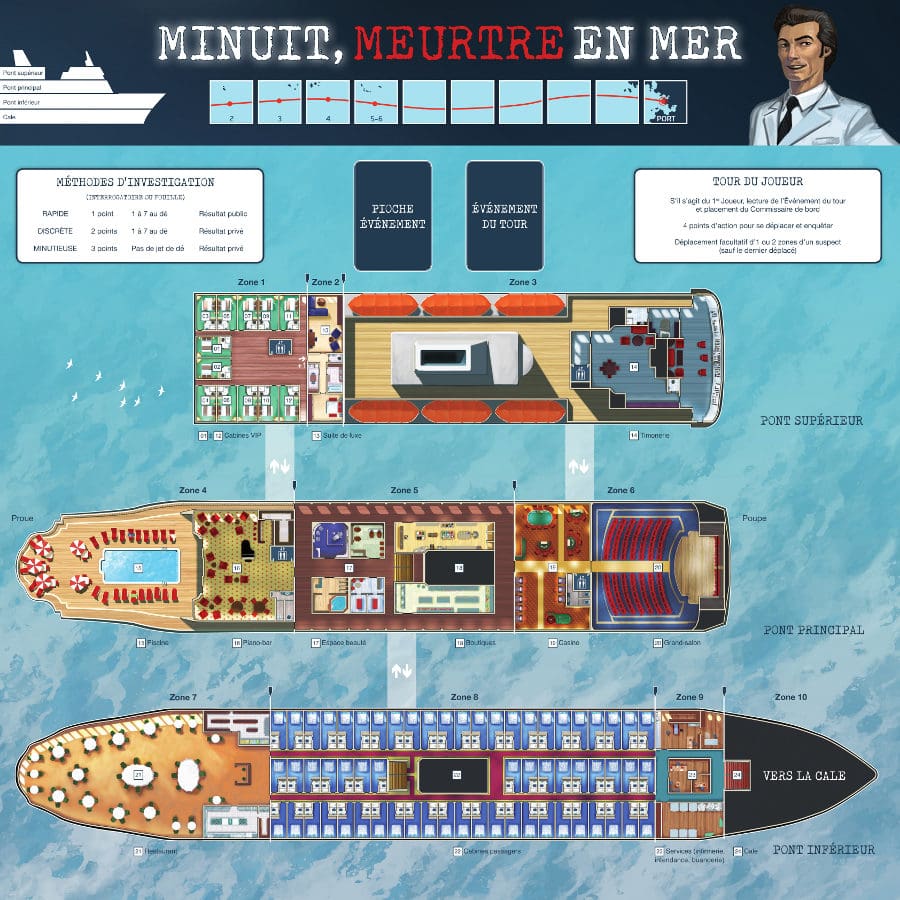 Le pitch rappelle Cluedo, ce jeu sorti en 1949 où c’est toujours le Colonel Moutarde avec le chandelier le coupable. Mais dans « Minuit, meurtre en mer », le processus de découverte se rapproche beaucoup plus des enquêtes policières, puisque les joueurs doivent parcourir le navire à la recherche d’indices et « parler » avec les protagonistes par l’intermédiaire d’un livret, rempli de déclarations des personnages, déclenchées par un système de codes.