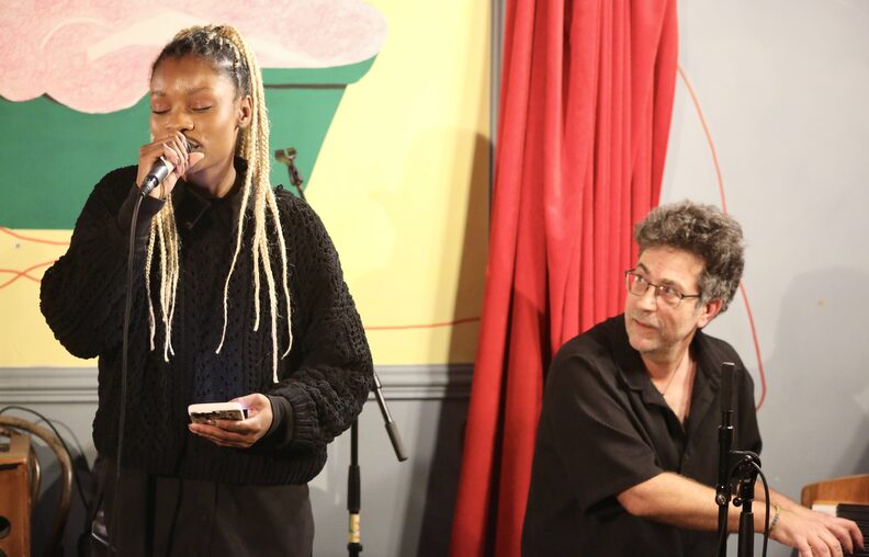 La traditionnelle scène ouverte du mardi soir bat son plein aux Savons d’Hélène. Serré autour de la sono, le public du bar est déjà chauffé par les premières prestations. Les conversations s’effacent peu à peu quand monte une voix douce, cristalline. Toute habillée de noir, Mirageuse ferme les yeux, ses longues tresses blondes tombent sur ses épaules. Elle reprend La vie en rose d’Édith Piaf. Le pianiste Fabrice l’accompagne de son doigté subtil, esquissant un large sourire. La jeune artiste est une figure familière des scènes ouvertes strasbourgeoises. Ce soir elle chante, mais il n’est pas rare de la voir rapper lors des soirées de Hip-Hop from Elsass à la Péniche Mécanique ou de Scratchy et La Sauce à la Planque.
