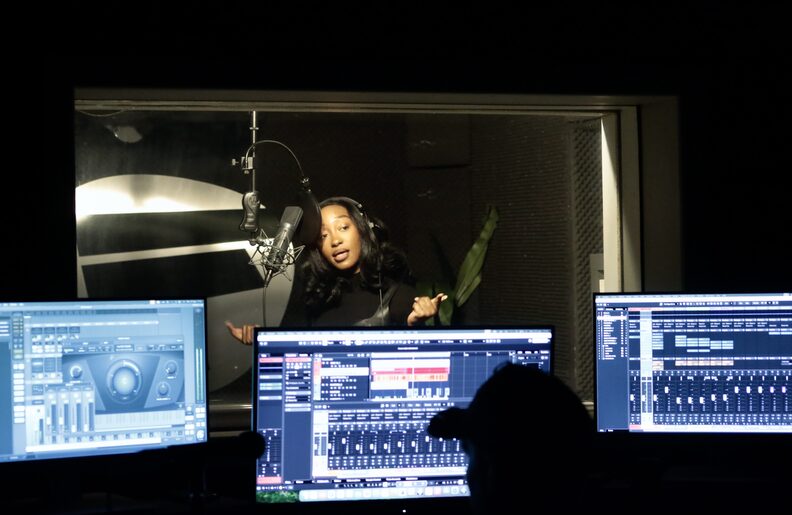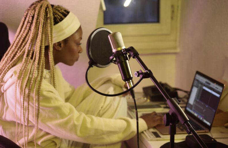 À quelques kilomètres de là, dans un ancien bâtiment industriel reconverti en studio, une autre voix s’élève. Derrière la vitre d’une cabine d’enregistrement, KYA Universe, toute vêtue de cuir, ajuste son casque. Elle prend soin de ne pas abîmer sa coupe impeccable. Elle aussi connaît bien les scènes de la ville. Face au micro, elle reprend une phrase, la corrige, recommence. « Je cherche toujours la bonne formule. J’expérimente pour trouver le truc qui sonne juste », explique-t-elle. De l’autre côté de la vitre, l’ingé son reste concentré sur ses écrans. C’est derrière ces briques rouges qu’elle a sorti son premier projet en 2022, aidée par le label Facctory qui gère le studio.