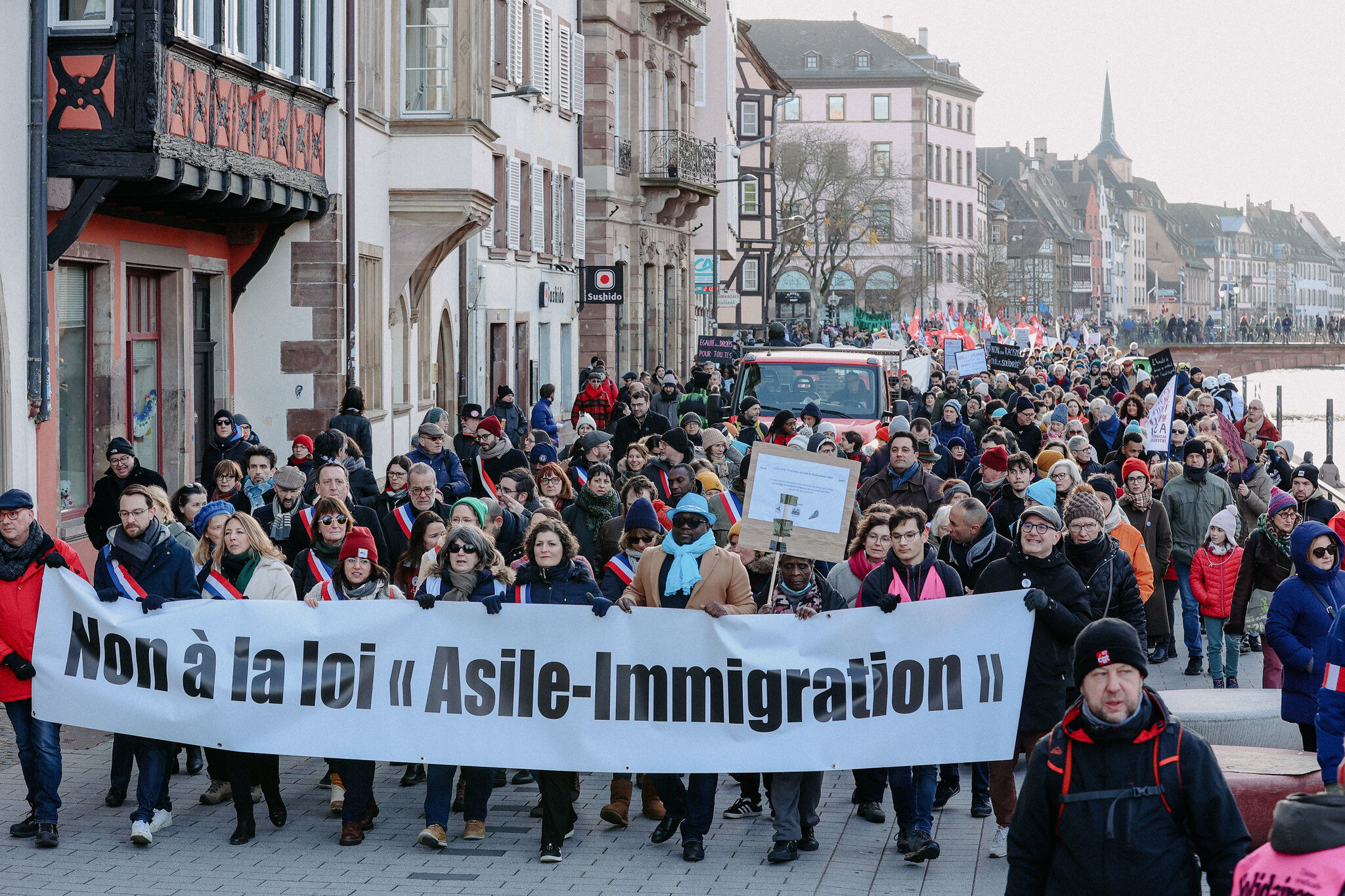 À Strasbourg, le texte provoque des manifestations. Dès le début de l’année, un large front social se forme pour dénoncer le texte et battre le pavé. Au conseil municipal, la droite strasbourgeoise n’est pas à l’aise pour défendre un texte autant marqué par l’empreinte de l’extrême droite. La mobilisation s’essoufflera à la fin de l’hiver, alors qu’en parallèle le Conseil constitutionnel censure une large partie de la loi.