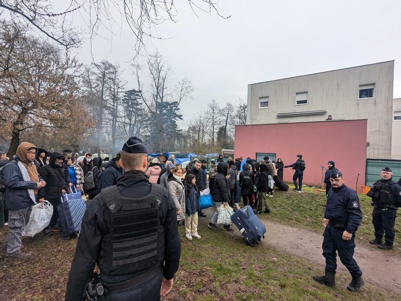 C’était la première fois qu’un campement aussi important existait à Strasbourg en plein hiver. Des familles avec enfants, des personnes âgées, des malades, des mères célibataires luttaient contre le froid, faute de réponse positive lorsqu’elles appelaient le 115 – numéro pour demander un hébergement d’urgence. Pour obtenir la mise à l’abri d’une partie des personnes, la Ville a demandé le démantèlement du camp au tribunal administratif. Mardi 11 février aux alentours de 13h30, la police nationale a commencé son opération d’évacuation.