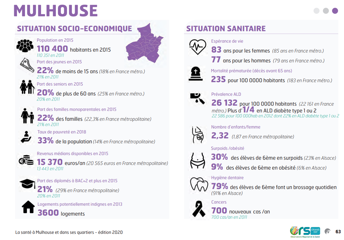 Le rapport fait état de la situation sanitaire des Mulhousiens plus précaire que la moyenne française dans une infographie qui relève un plus fort taux de maladies chroniques et une espérance de vie moindre :
