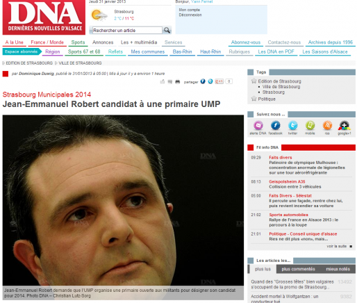 Et une candidature de plus à droite, à un an de l’élection municipale, une ! Après Fabienne Keller (UMP) et François Loos (UDI), le conseiller municipal d’opposition Jean-Emmanuel Robert a annoncé ce matin dans les DNA son souhait de briguer la tête de liste UMP en vue des municipales de 2014.